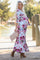 A floral print maternity maxi dress. V-neckline. Cinched under bust. Sash tie. 3/4 sleeves.