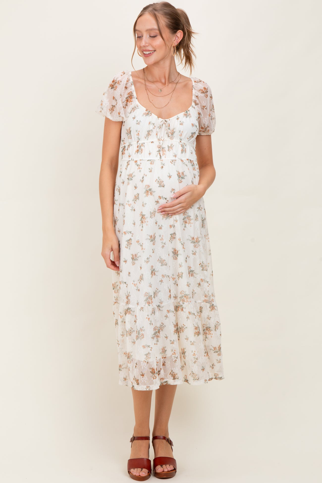 Ivory Floral Lace Overlay Puff Sleeve Maternity Midi Dress
