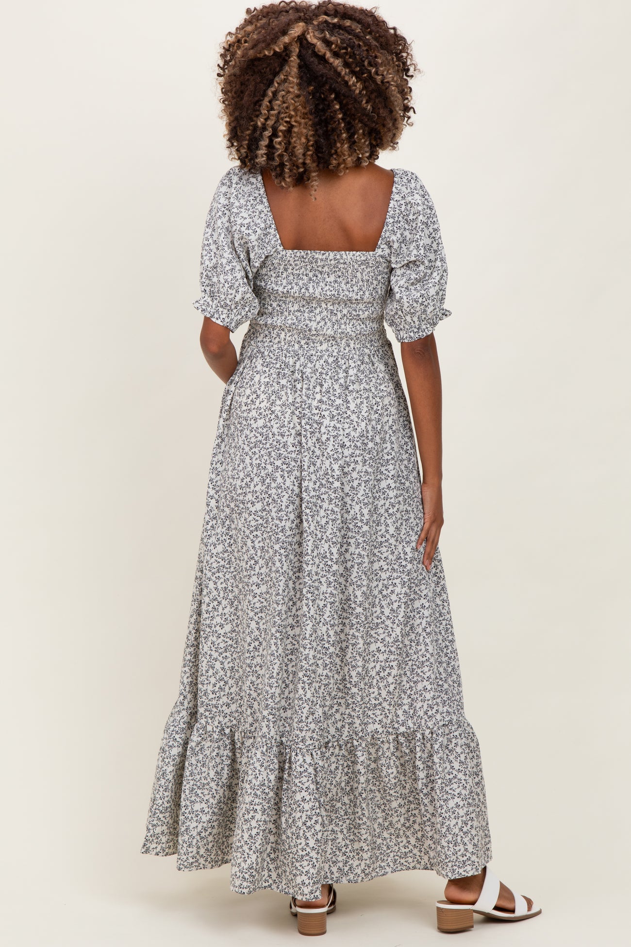 Embrace effortless elegance with our Ivory Floral Lace Trim Smocked Maternity Maxi Dress. Crafted for comfort and style, this dress features a delicate floral print on a soft ivory fabric, perfect for showing off your baby bump. The smocked bodice offers gentle stretch and support, while the lace-trimmed square neckline and puff sleeves add a touch of romantic charm. The flowing maxi length with a ruffled hem provides graceful movement and versatility for any occasion, from casual outings to special events. Pair it with sandals or heels for a chic maternity look you’ll love throughout your pregnancy.