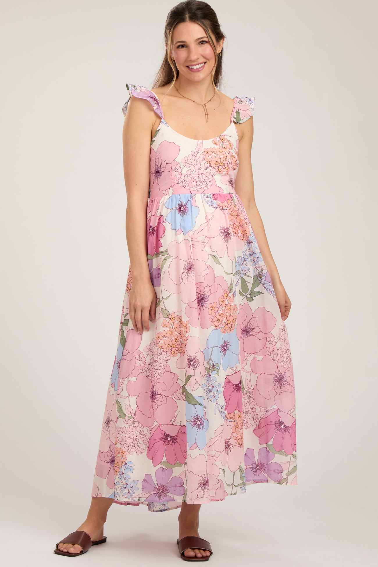 Details A floral maternity midi dress with a scoop neckline, ruffle cap sleeves, adjustable straps, a tie back closure, a hi-lo hem, and a back cutout. Content + Care