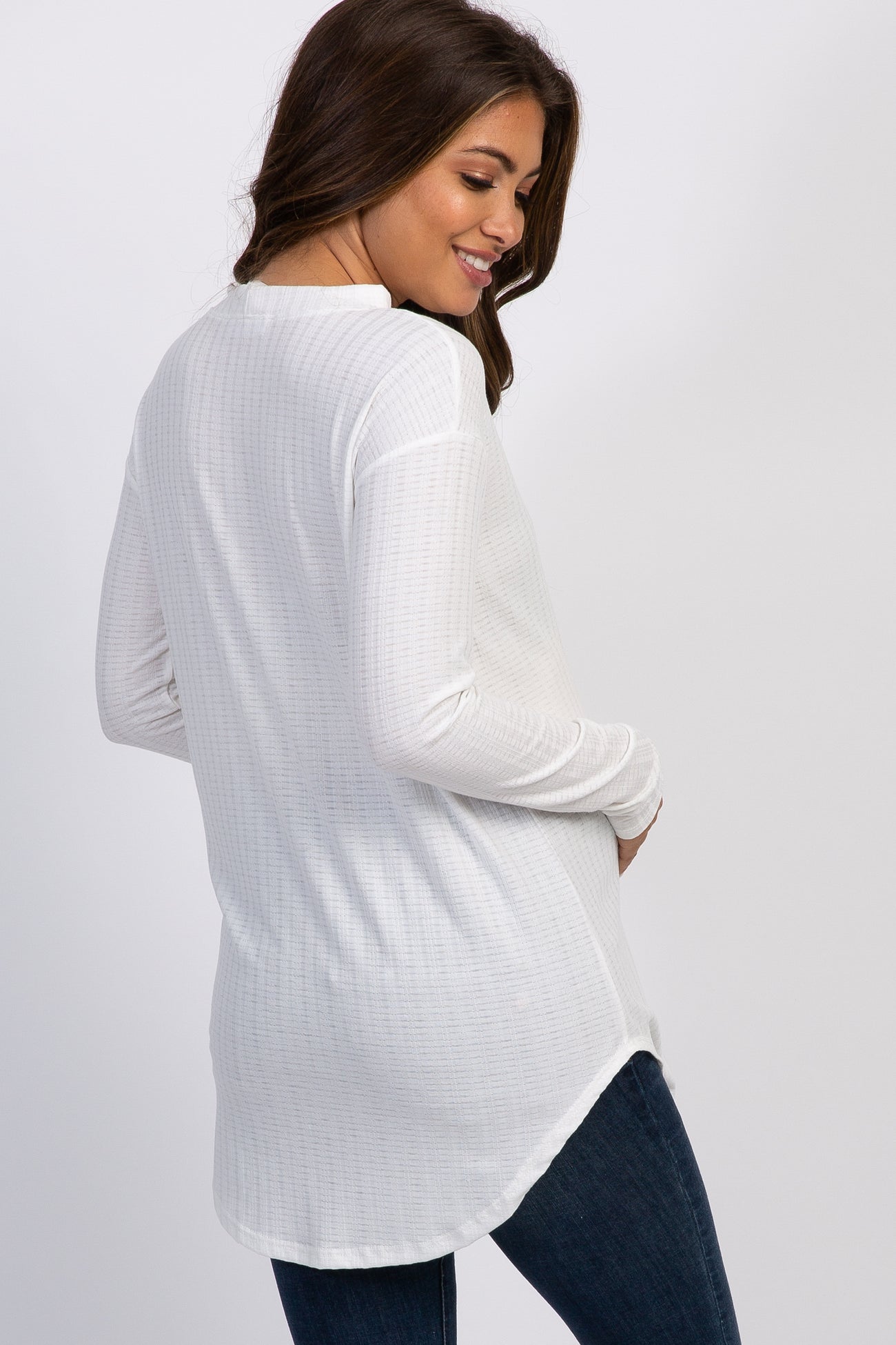 A solid hued maternity top featuring a ribbed texture, long sleeves, a curved hem, and a rounded neckline. This style runs big. We recommend sizing down.
