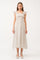 A midi dress with a ruffle accent squared neckline, smocked and ruffle straps, a smocked top, and side pockets. Dress is fully lined.