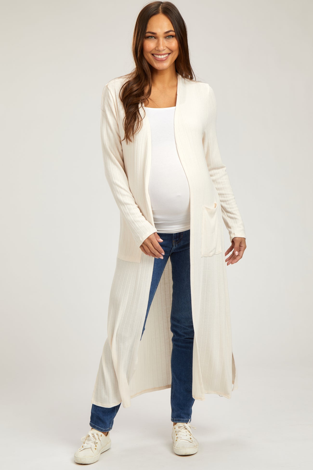 A rib knit maternity cardigan with long sleeves, front pockets, and side slits.