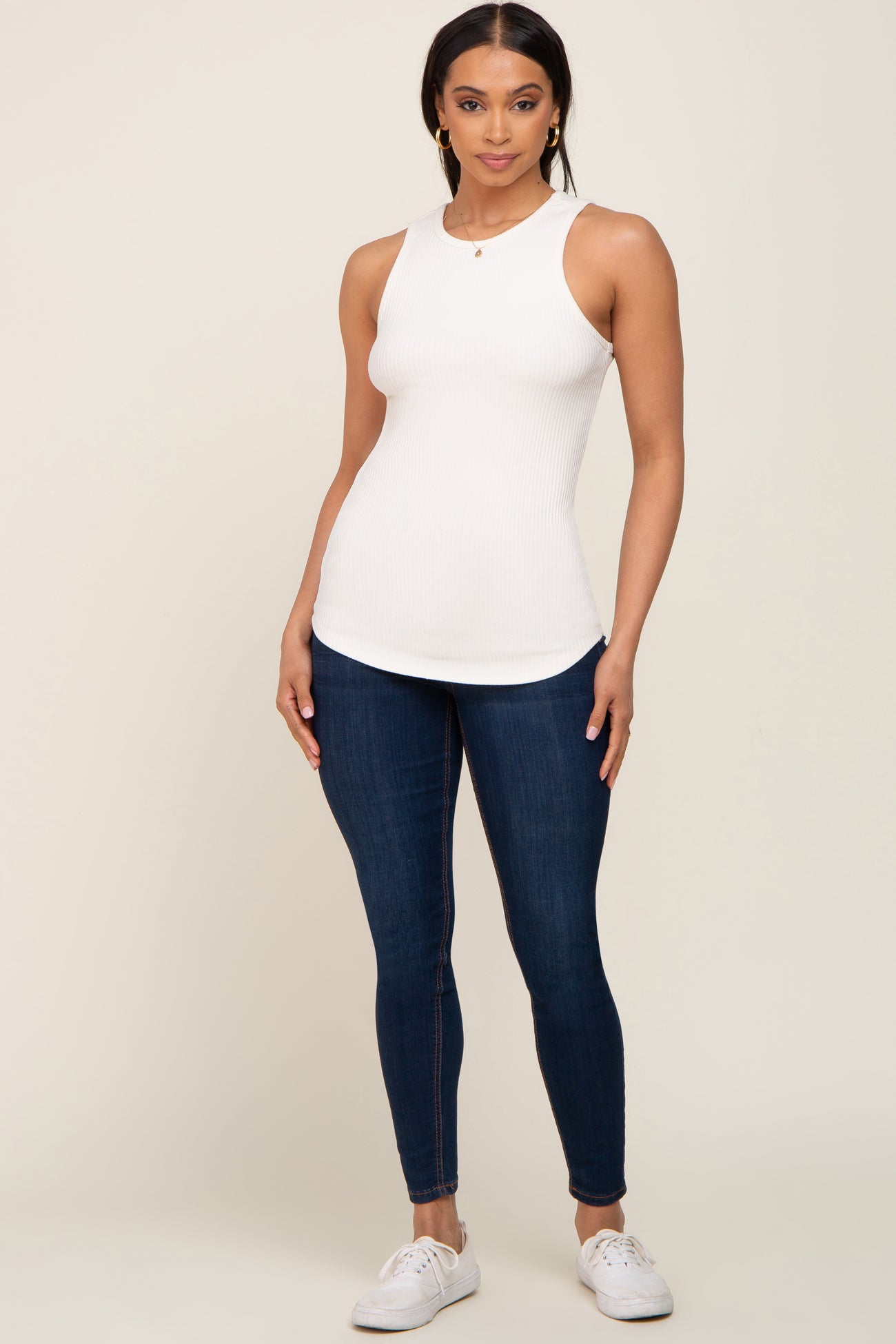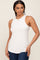 A basic solid tank top in a ribbed material with a higher neckline and rounded hem.