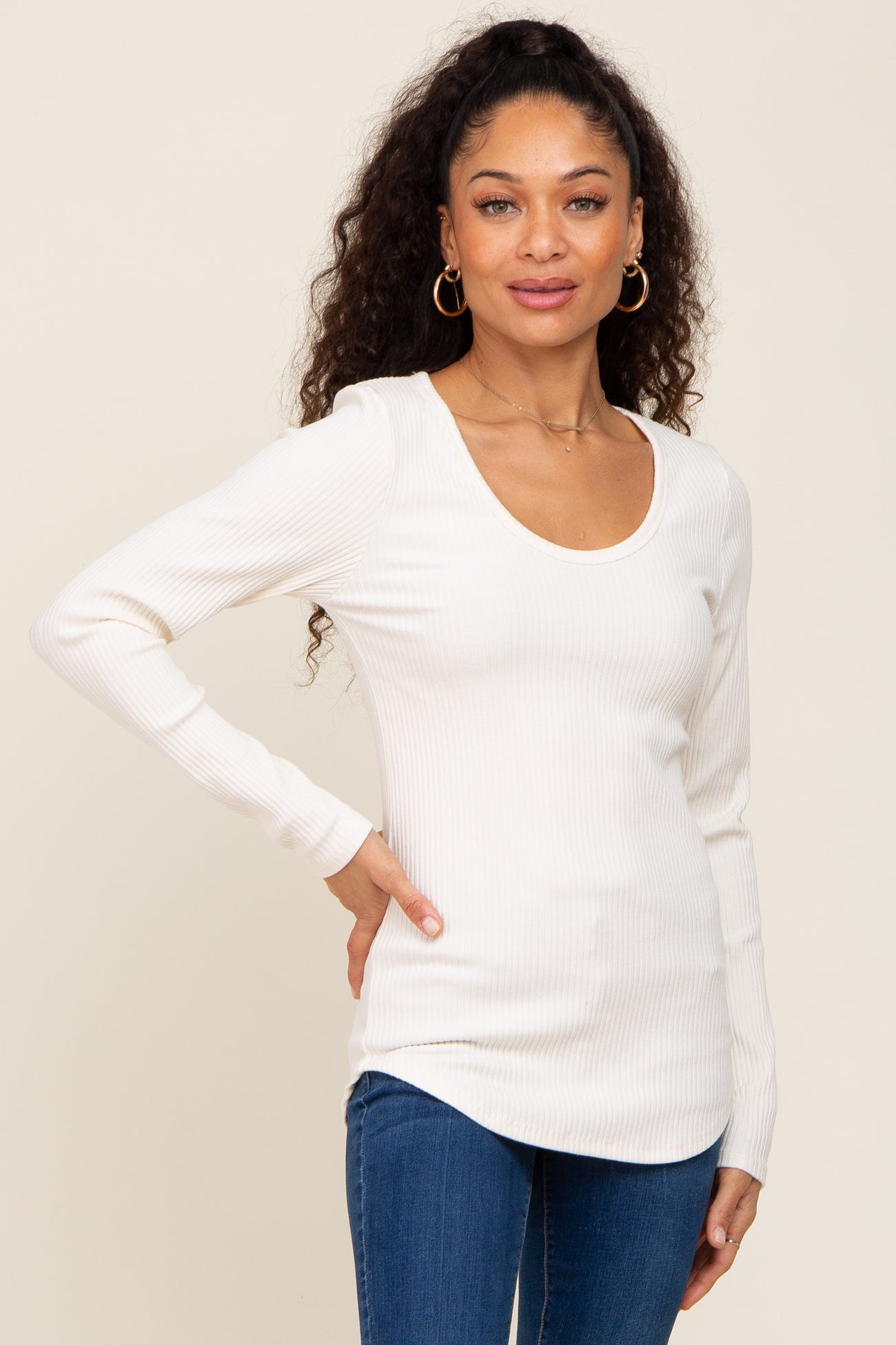 Ivory Ribbed Scoop Neck Long Sleeve Top