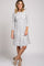 A ribbed, striped midi dress featuring a pleated skirt, a cinched elastic waistline, 3/4 sleeves and a rounded neckline. This style runs small.