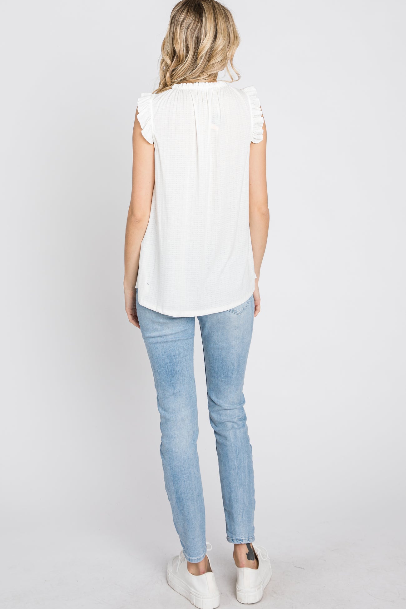 Details A solid tank top with ruffle accents at the sleeve openings and the neckline. Content + Care