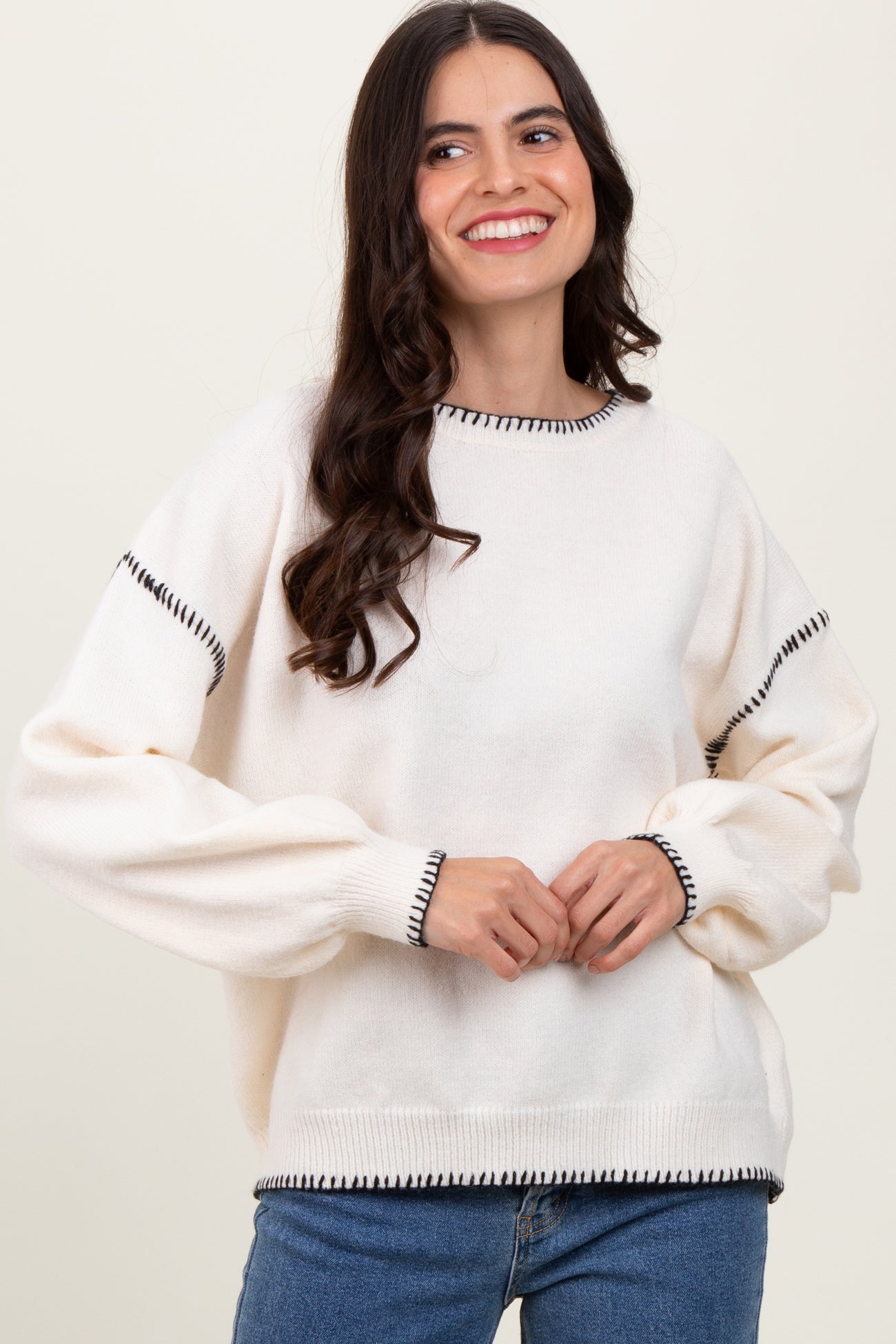 Ivory Top Stitch Detail Drop Shoulder Sweater