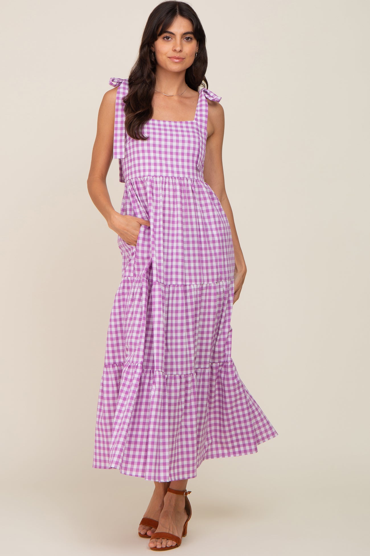 A sleeveless checkered print maternity maxi dress featuring self-tie shoulder straps, a smocked back, a tiered skirt, side pockets and a square neckline.