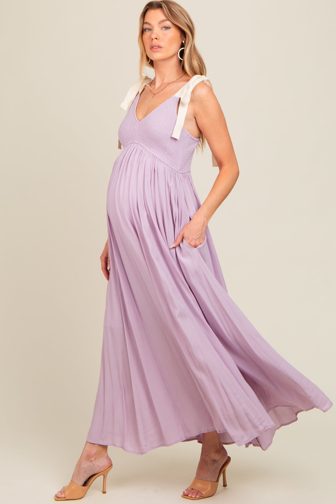 Lavender Contrast Shoulder Tie Smocked Maternity Maxi Dress