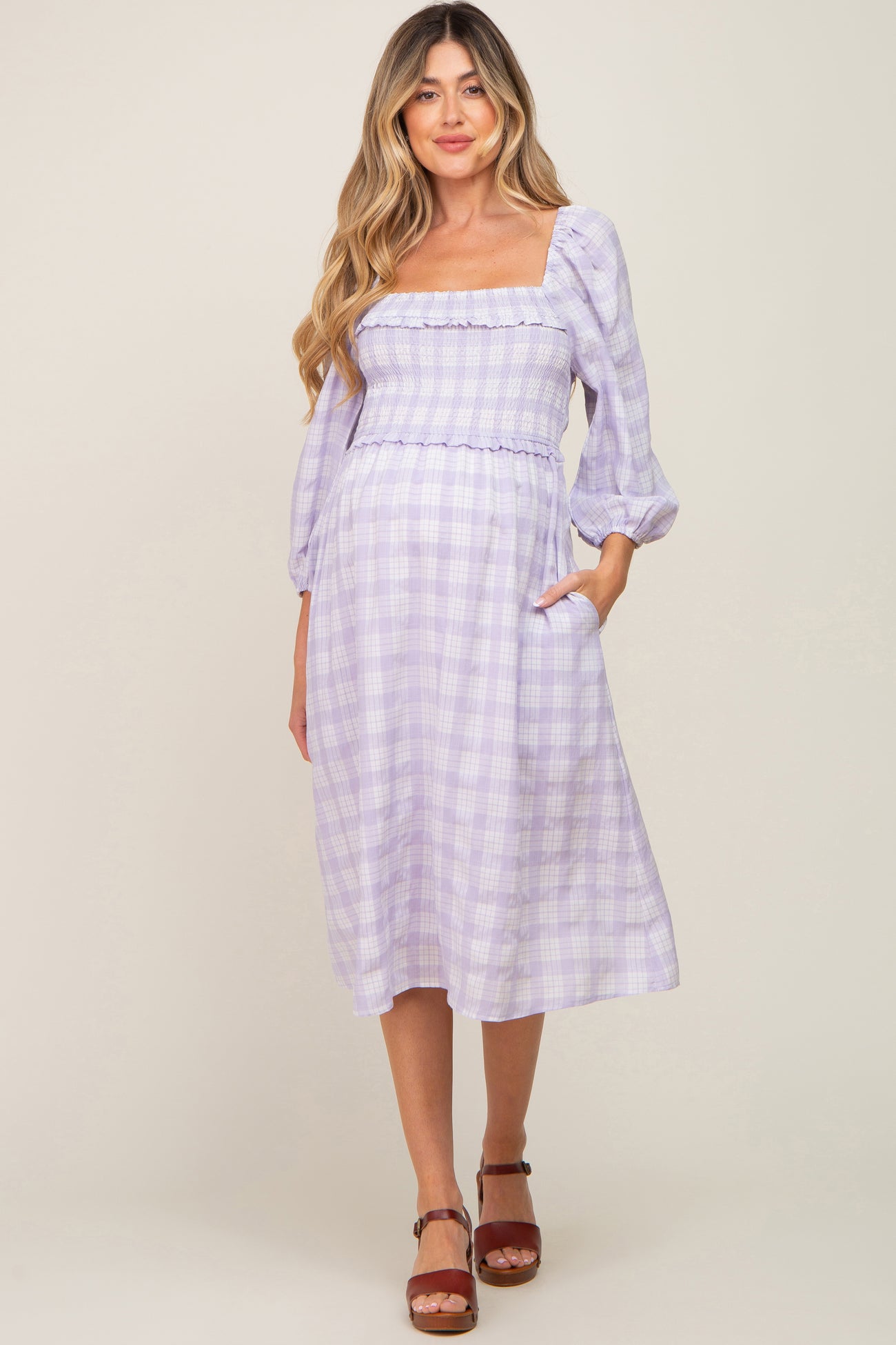 Lavender Plaid Smocked Square Neck Lace-Up Back Maternity Midi Dress