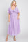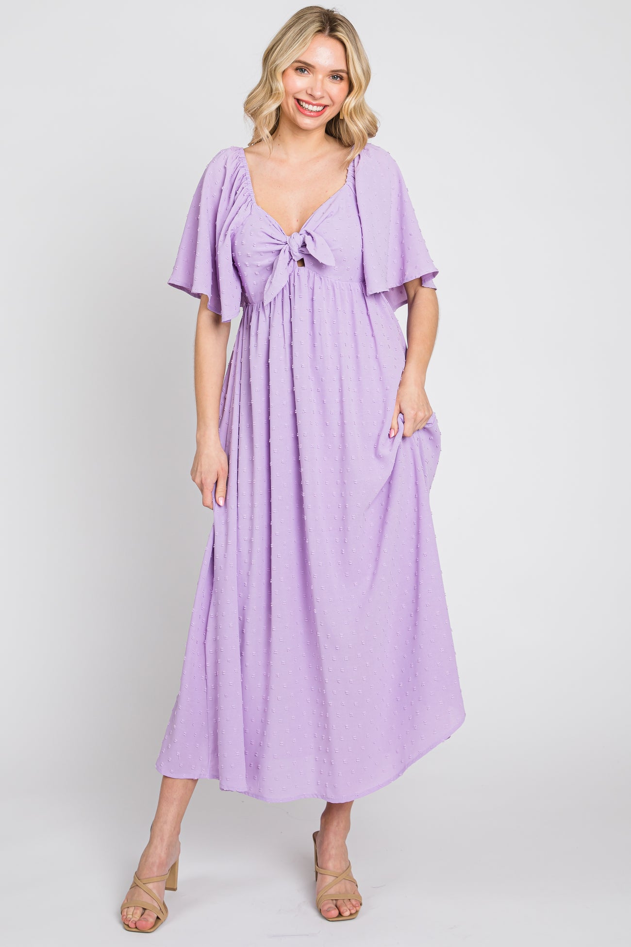 Lavender Textured Dot Front Tie Ruffle Sleeve Midi Dress