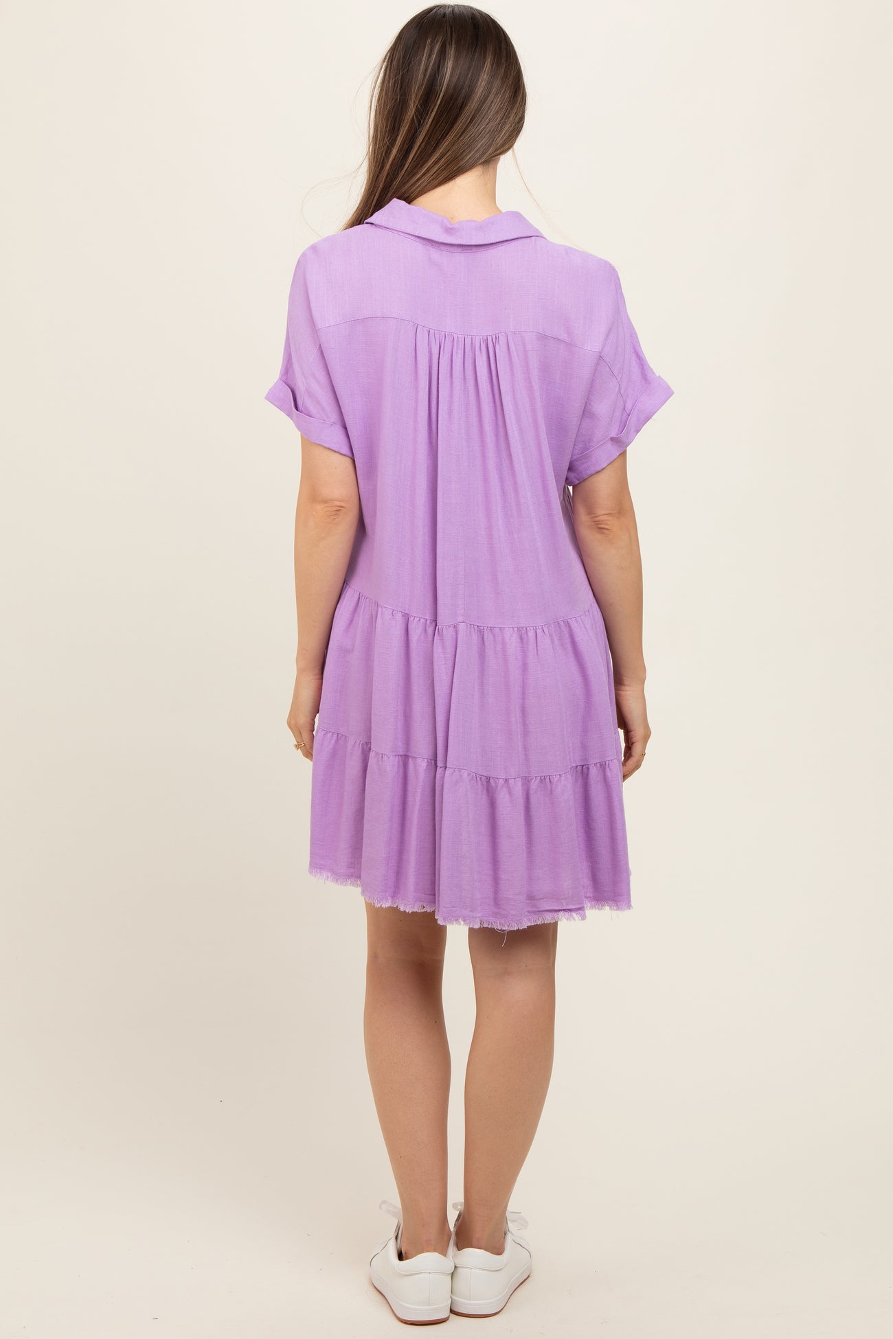 A lightweight linen maternity dress with a split v-neckline, a collar, and a tiered body.