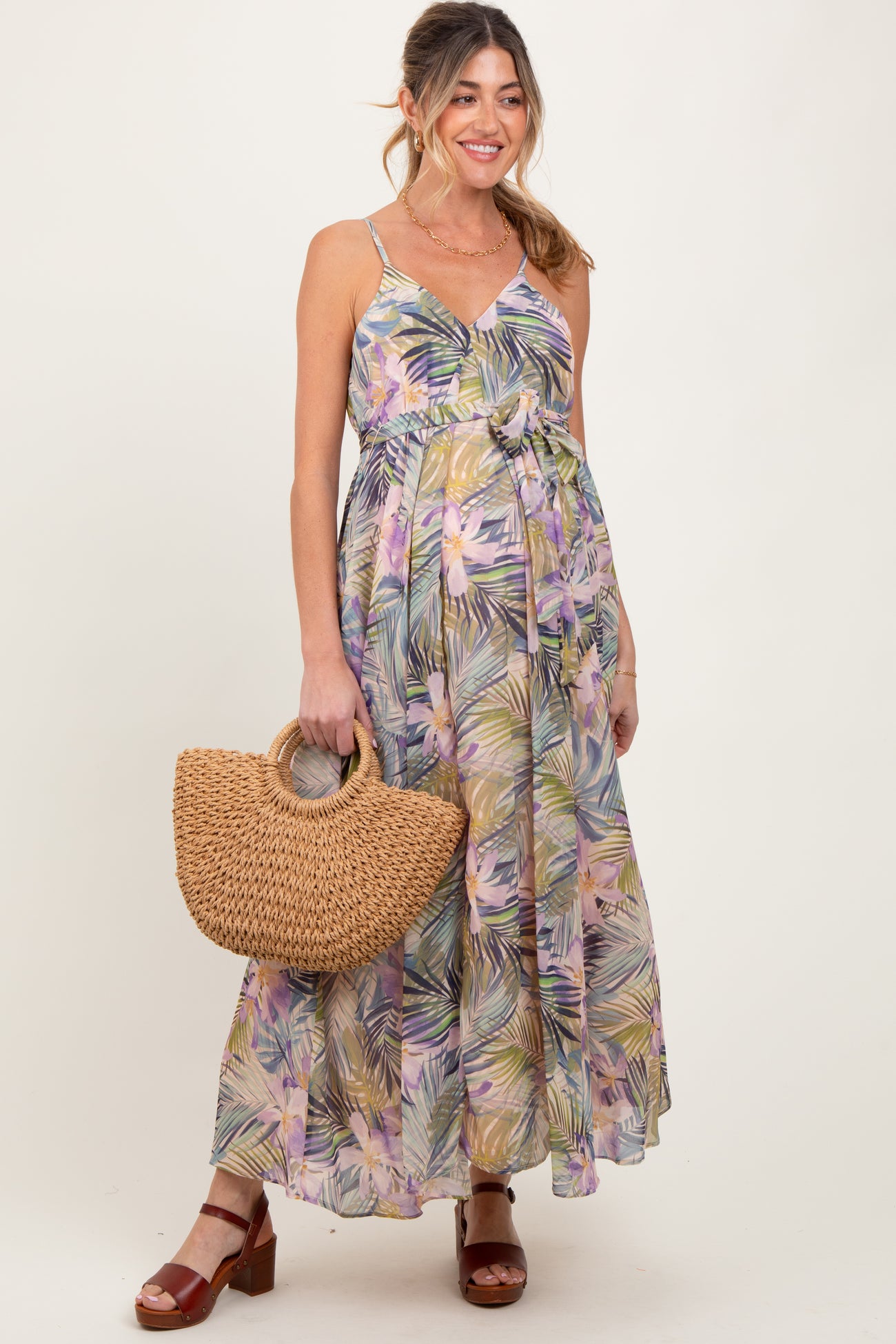 Lavender Tropical Floral Sash Tie Maternity Maxi Dress