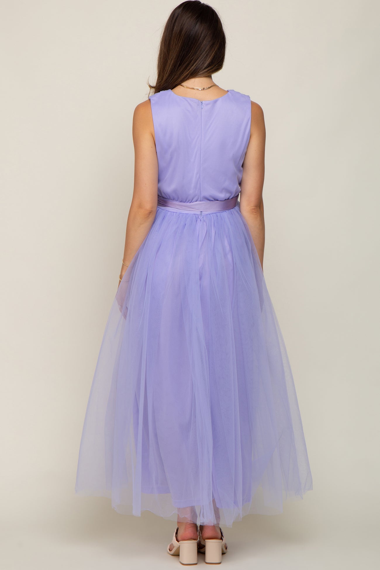 Lavender Wrap V-Neck Waist Tie Tulle Maternity Midi Dress
