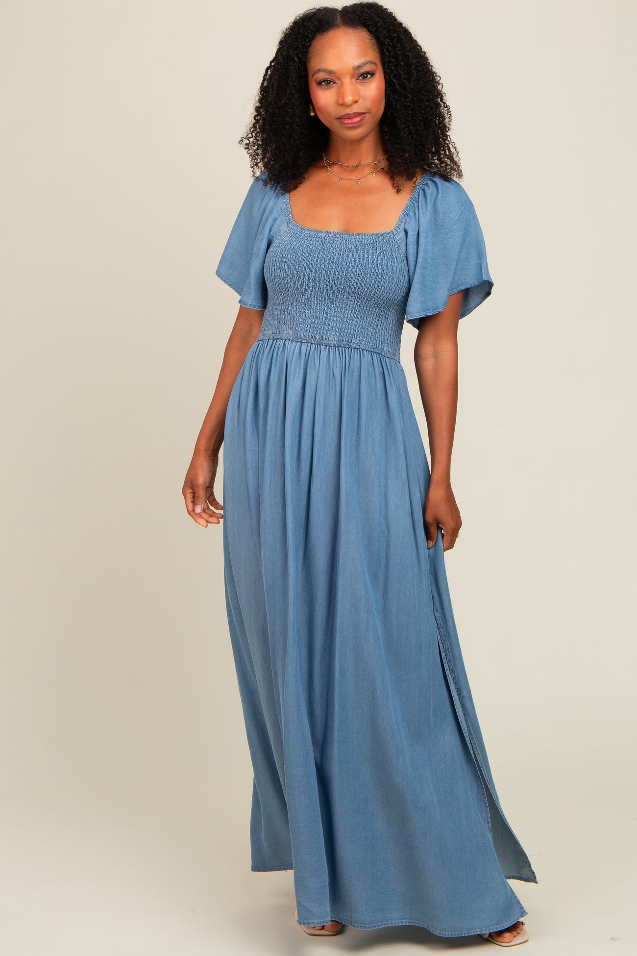 Embrace effortless style with our Light Blue Chambray Smocked Maxi Dress. Featuring a flattering smocked bodice and a square neckline, this dress highlights your silhouette while offering comfort. The soft chambray fabric gives it a casual yet chic vibe, perfect for day or evening wear. Flutter sleeves add a touch of feminine elegance, and the flowing maxi skirt with a side slit ensures ease of movement. Pair it with sandals for a relaxed look or dress it up with heels for special occasions. Ideal for warm seasons, this versatile maxi dress is a must-have addition to your wardrobe.