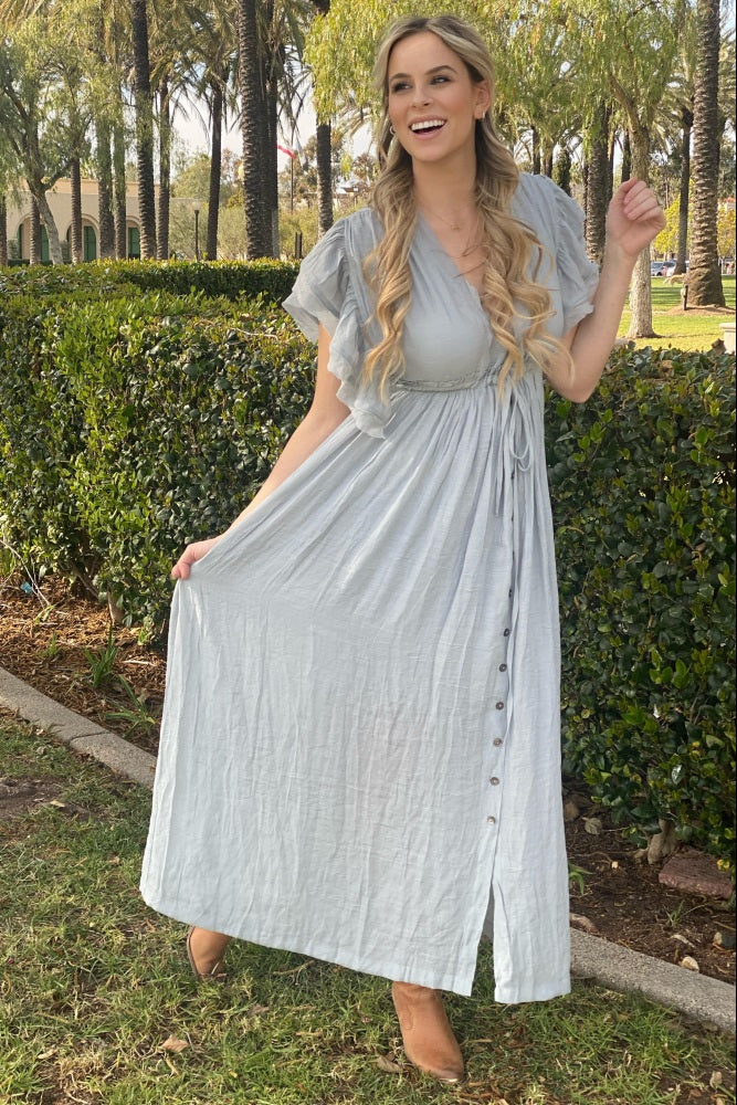 A solid short sleeve maternity maxi dress with a deep v-neckline, ruffle accent sleeves, button down closure in front and tie accent in back. Skirt is partially lined. Pocketed.