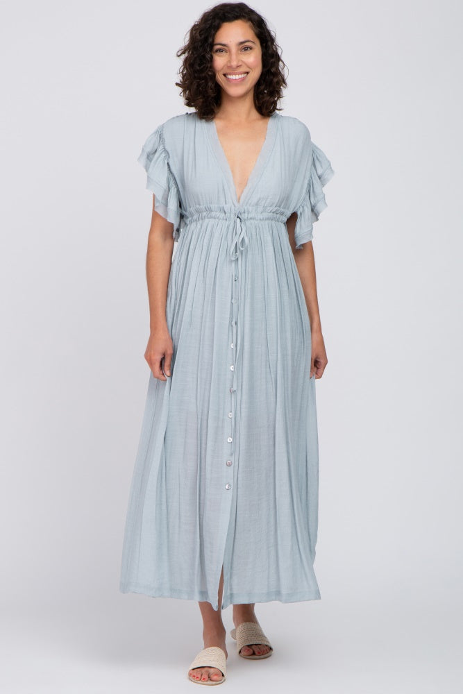 Light Blue Deep V-Neck Button Down Maternity Maxi Dress
