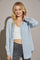 A light blue lightweight smooth top featuring a collared neckline, a button up front and long sleeves.