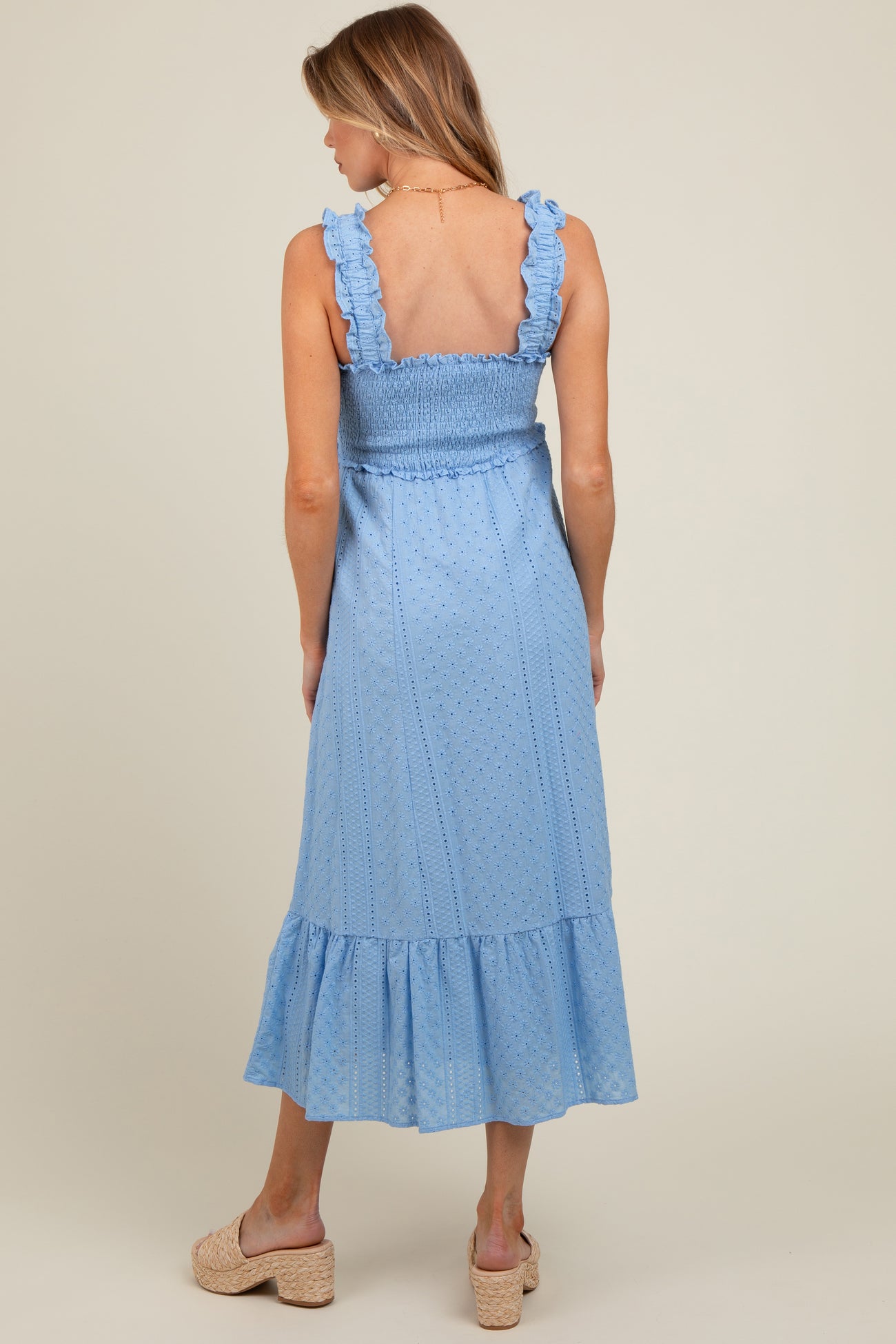 An eyelet maternity midi dress featuring a square neckline, elastic ruched straps, a smocked bodice, a ruffle hem and double lined.