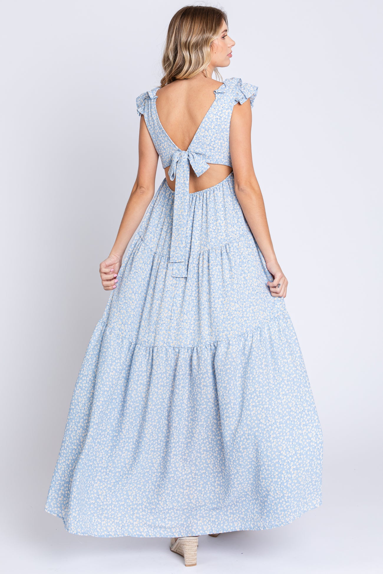 A floral maxi dress with a deep v-neckline, capped ruffle sleeves, a tied back tie, an open back, and a tiered skirt. Dress is partially lined.