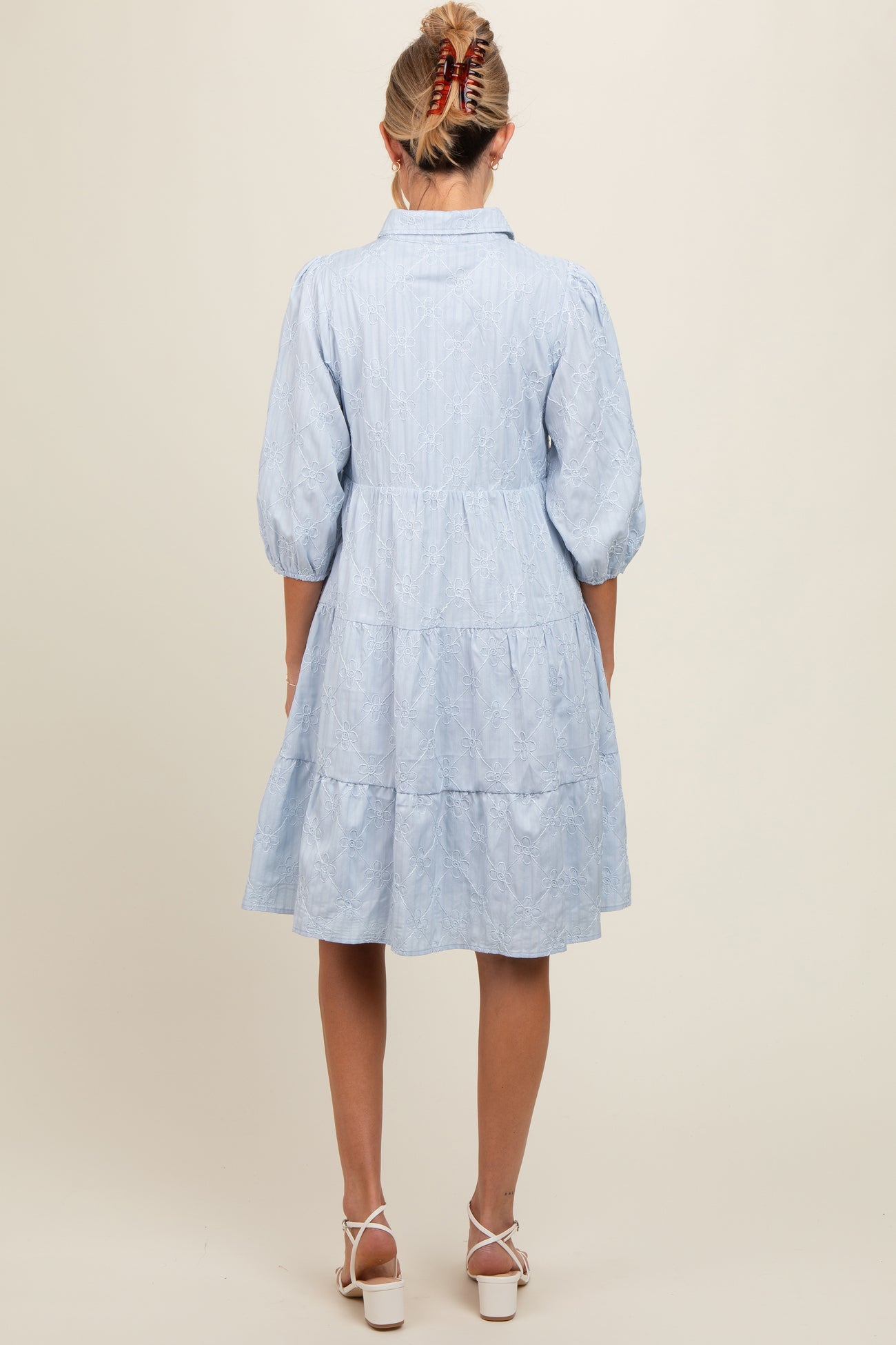 Light Blue Floral Embroidered Collared Button Down Maternity Dress