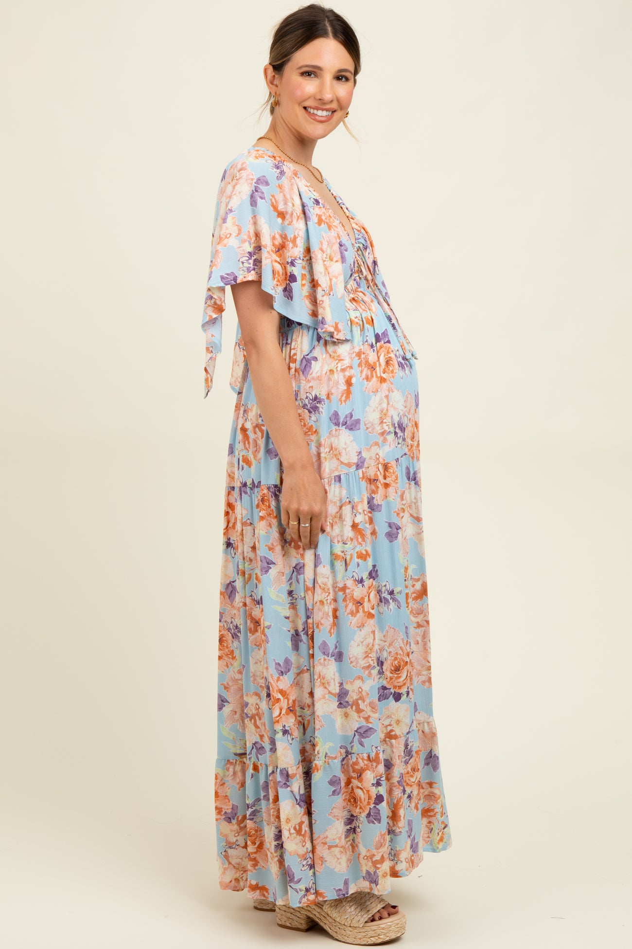 Light Blue Floral Flyway Sleeve V-Neck Tiered Maternity Maxi Dress