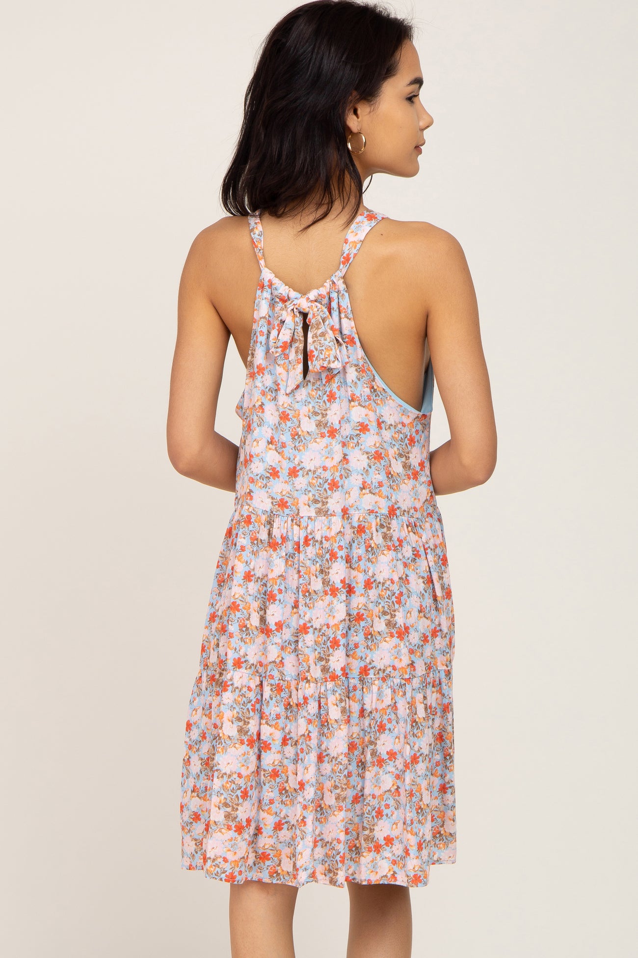 A floral print dress featuring a self-tie halter neckline and a tiered body. Double lined.
