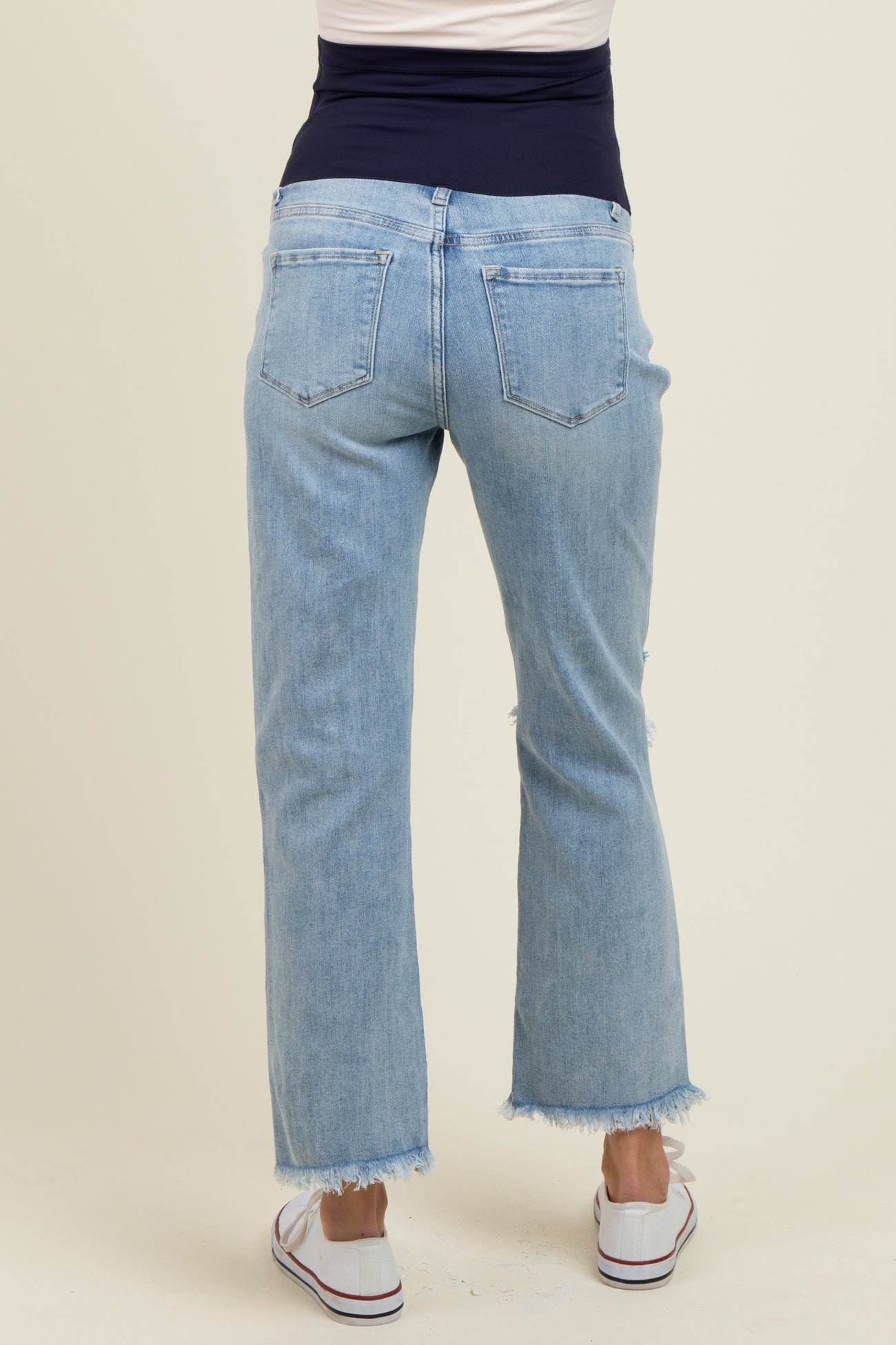 Light Blue Ripped Knee Fringe Hem Straight Leg Maternity Ankle Jeans