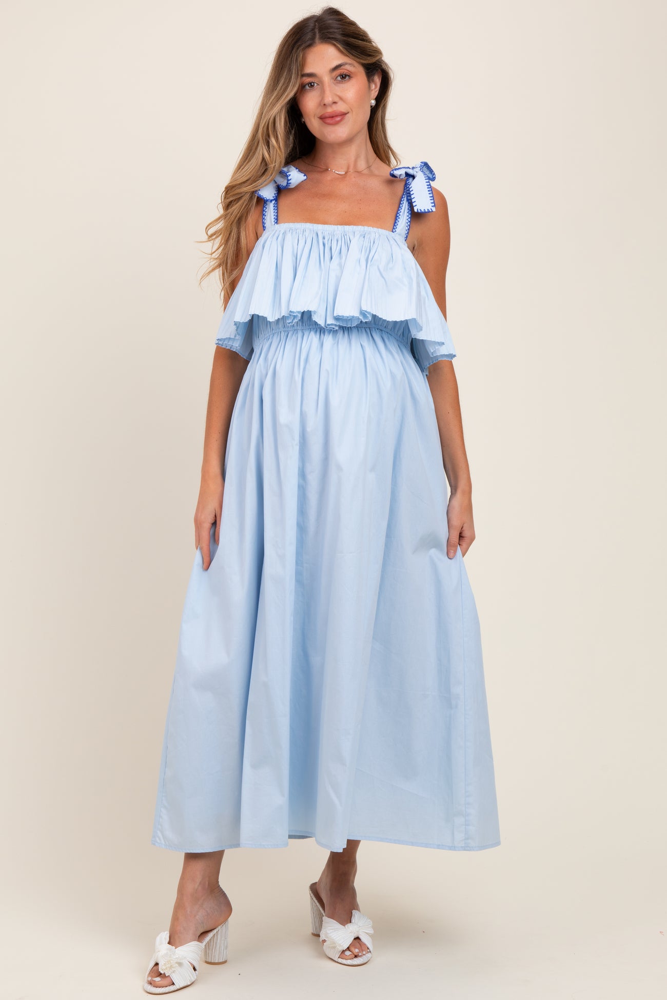 Light Blue Shoulder Tie Flounce Maternity Midi Dress