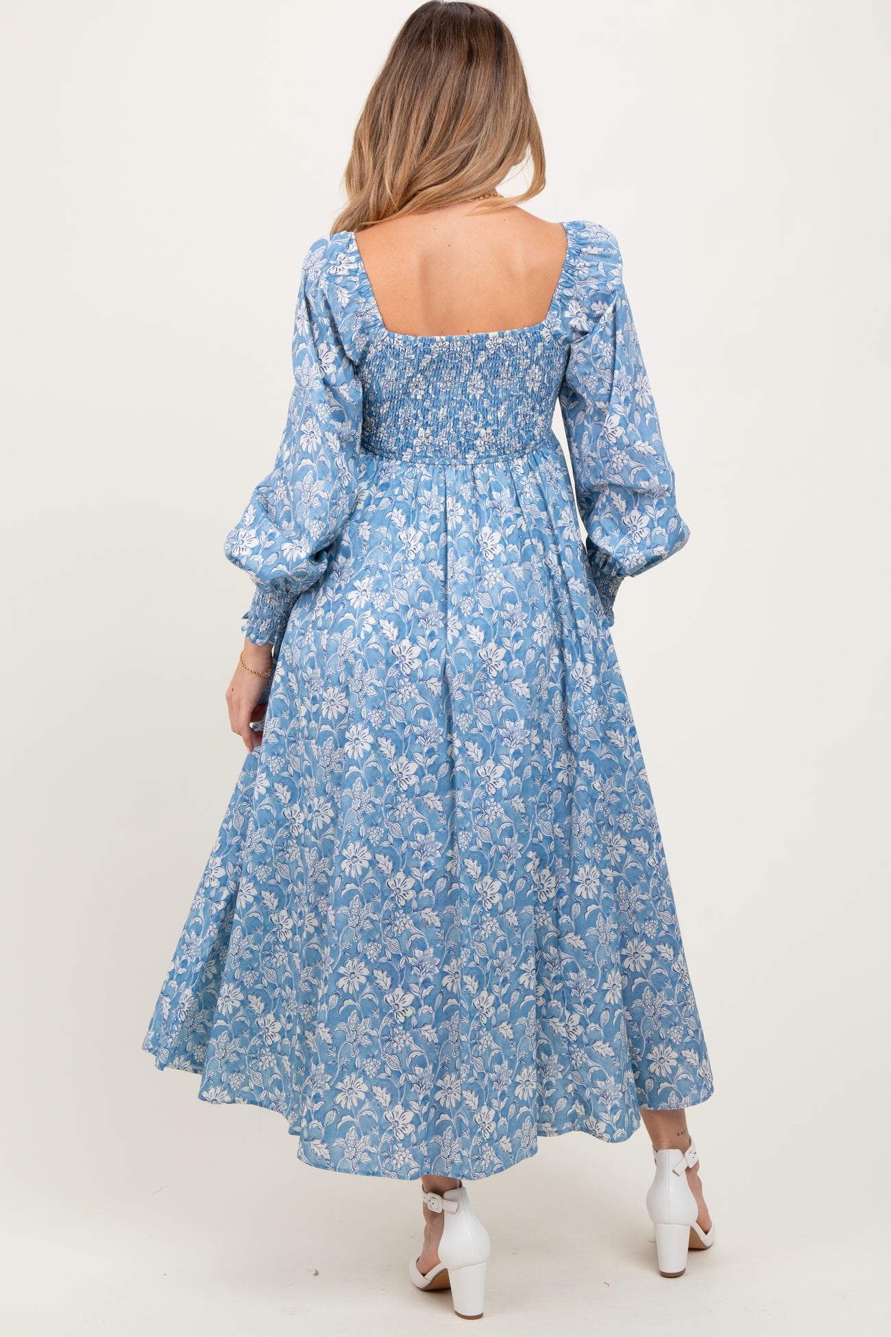 Light Blue Smocked Cotton Floral Maternity Maxi Dress