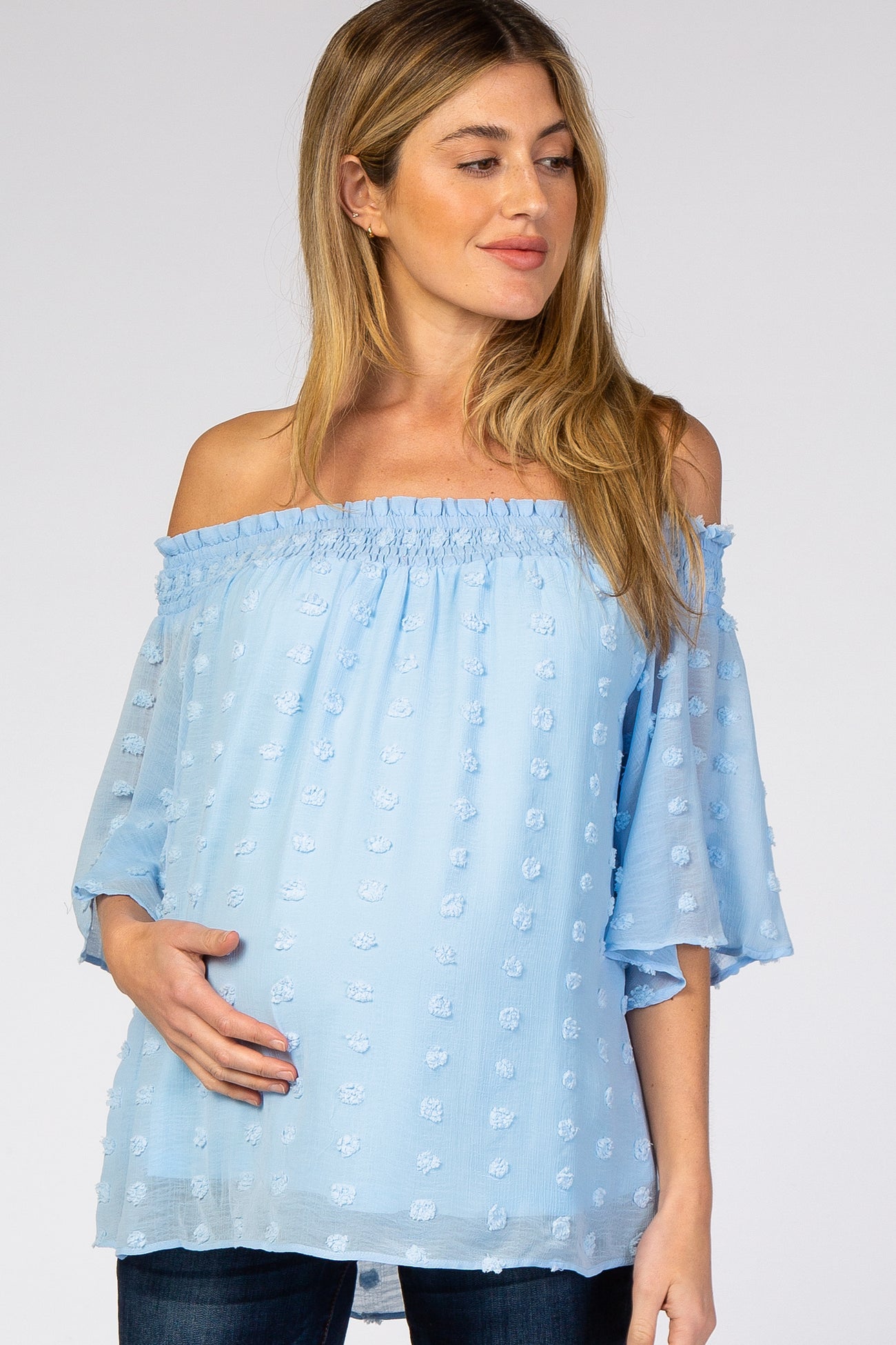 Light Blue Textured Dot Smocked Off Shoulder Chiffon Maternity Blouse