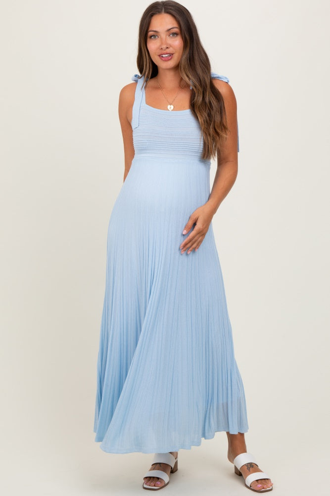 Light Blue Textured Knit Shoulder Tie Maternity Midi Dress