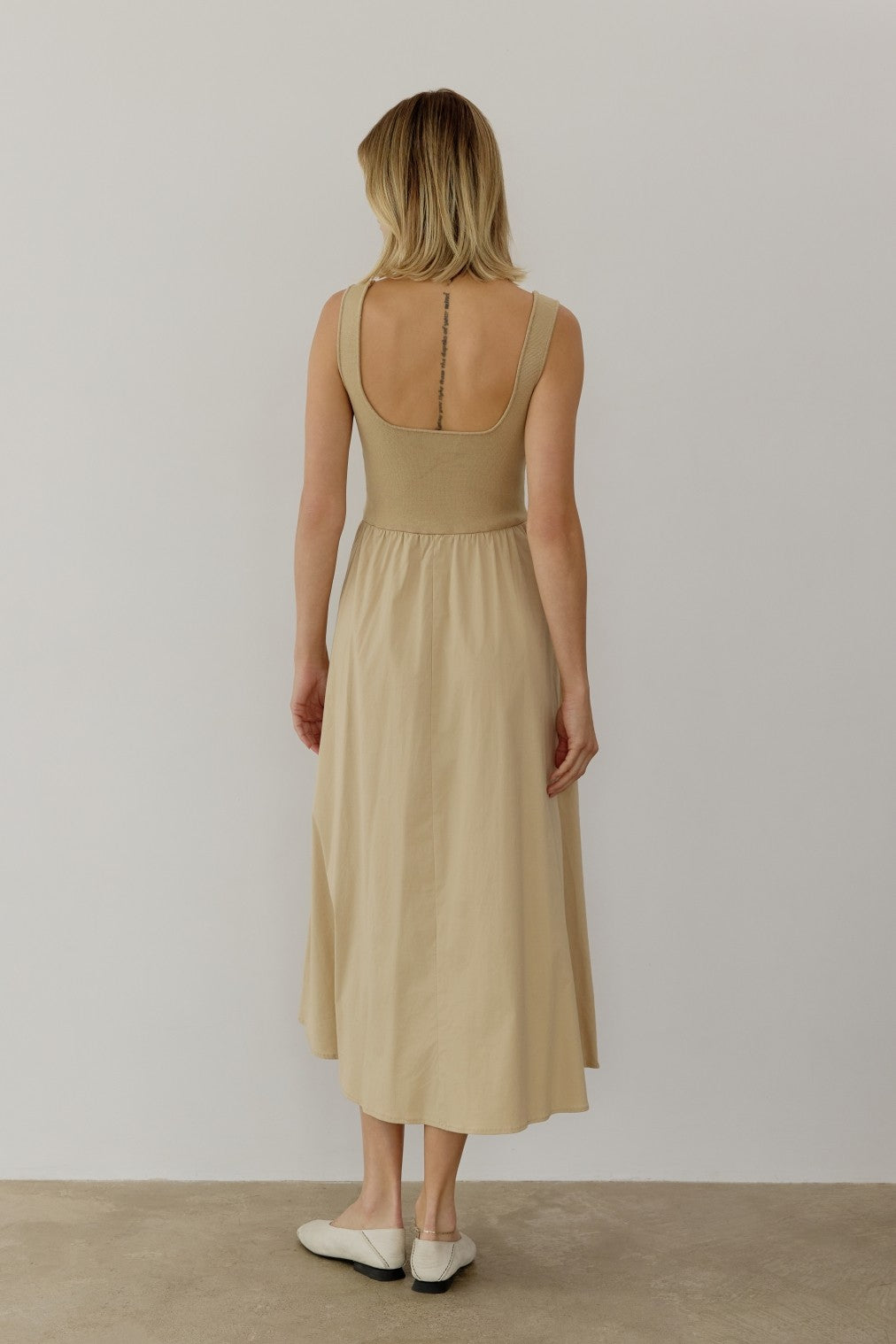 Light Camel Contrast Knit Poplin Sleeveless Midi Dress