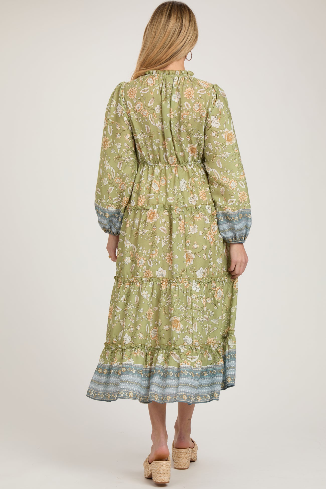 A floral maternity midi dress featuring a ruffled deep v-neckline, a front tie, long sleeves, and a tiered ruffle tier skirt.