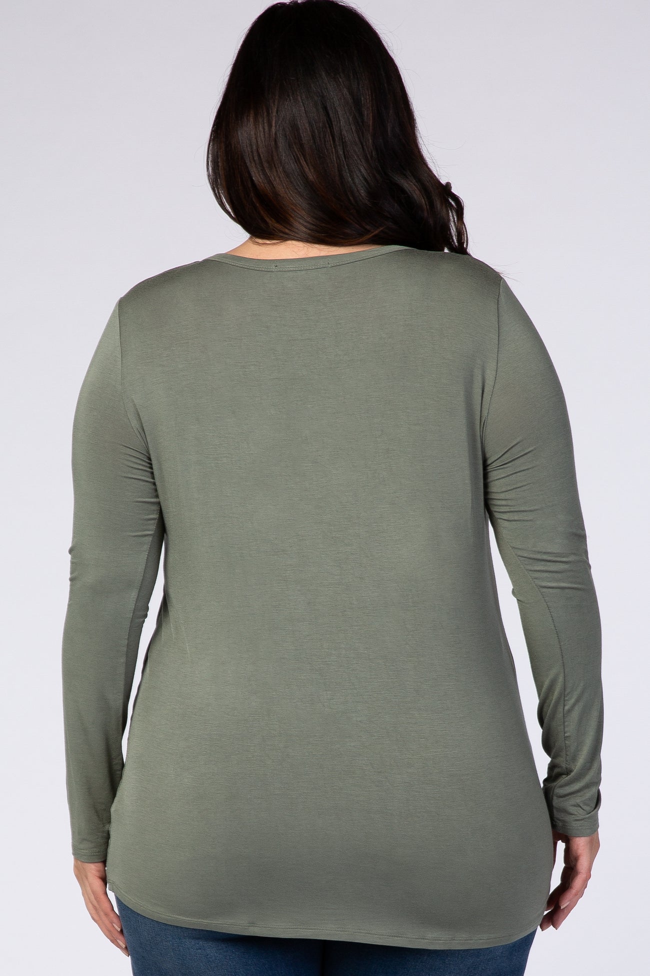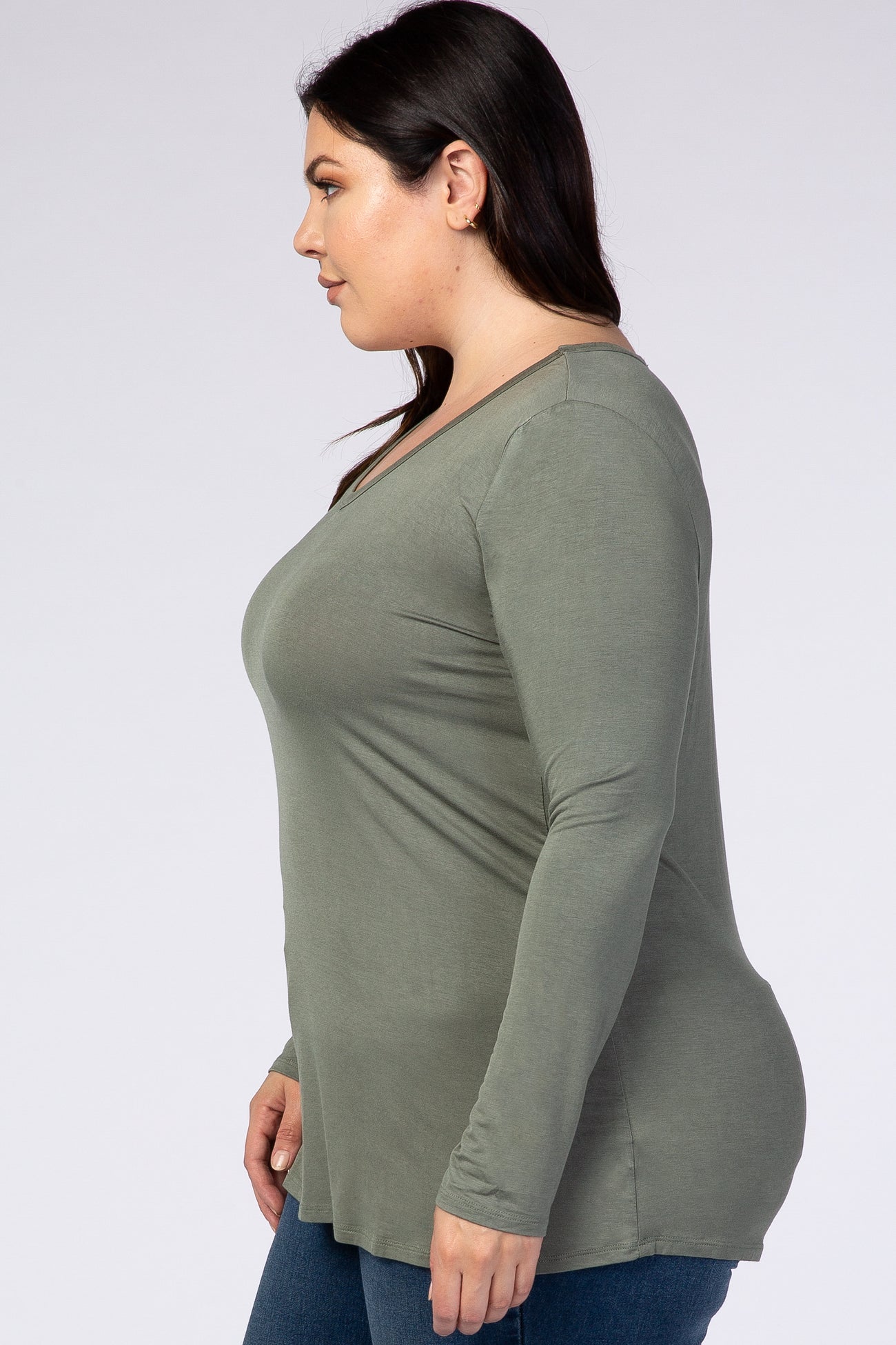A basic, solid hued plus size top with long sleeves and a rounded v-neckline.