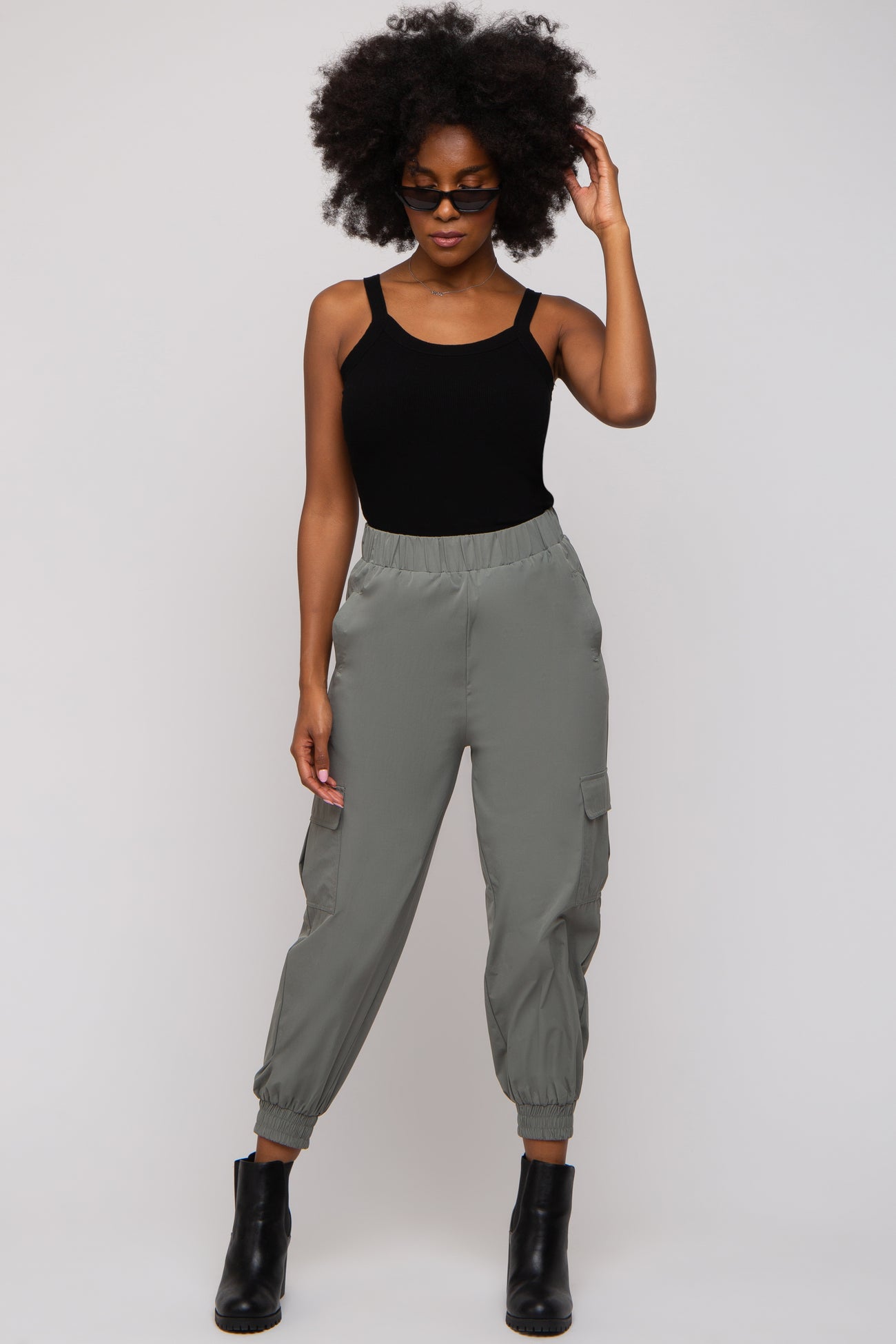 A solid pair of joggers with an elastic waistband, side pockets cargo pockets.