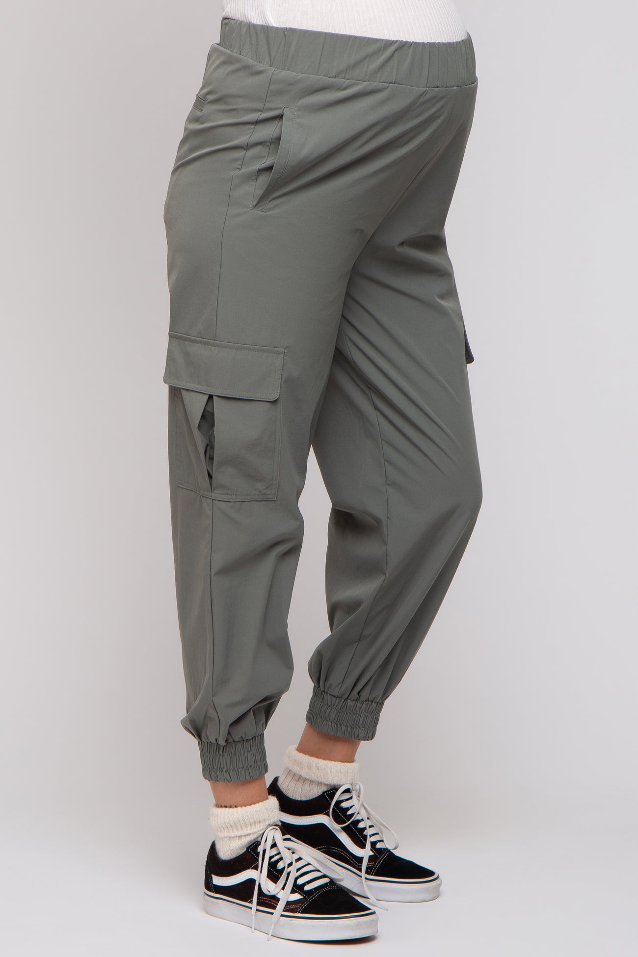 A solid pair of maternity joggers with an elastic waistband, side pockets cargo pockets.