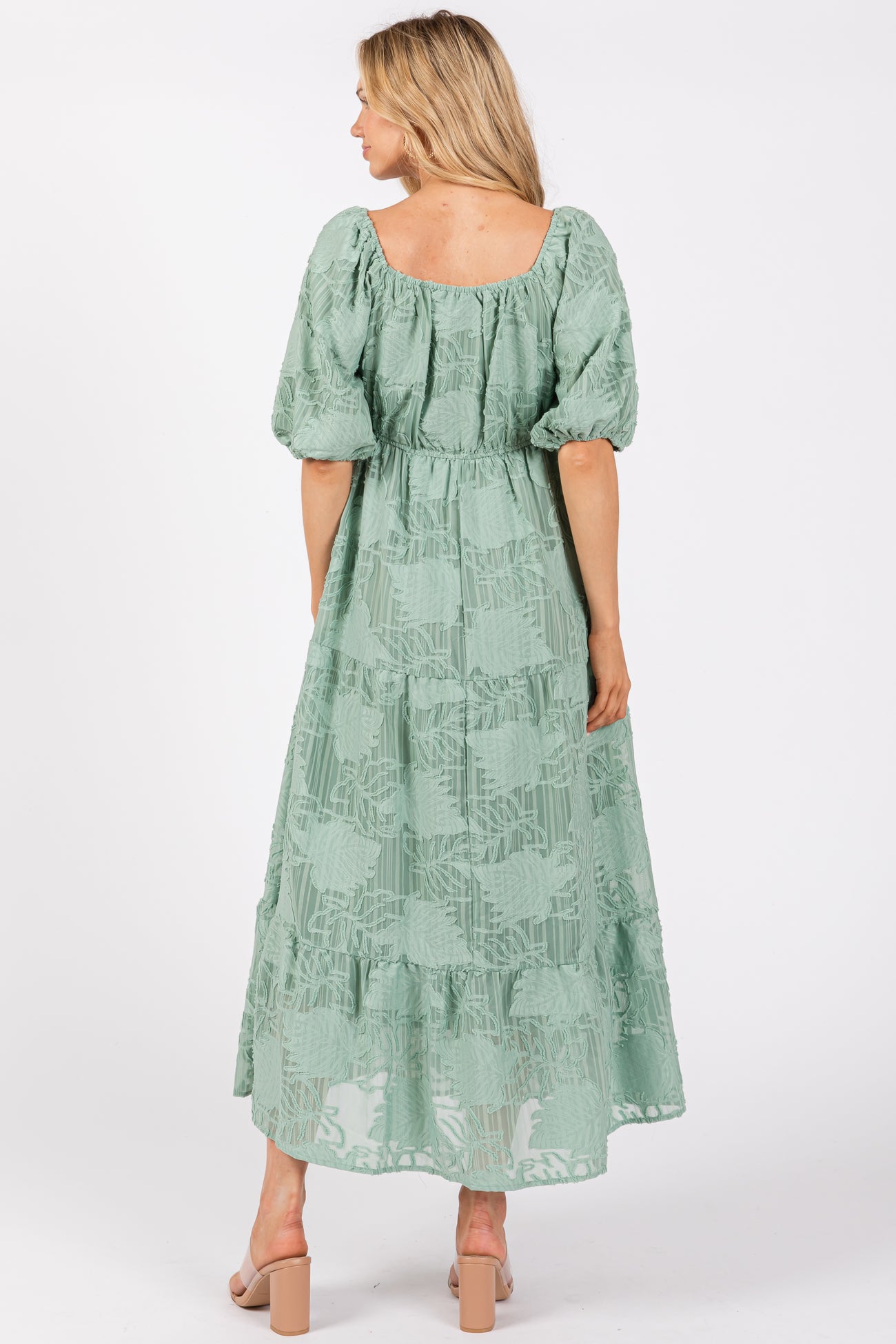 Light Olive Embroidered Leaf Print Striped Maxi Dress