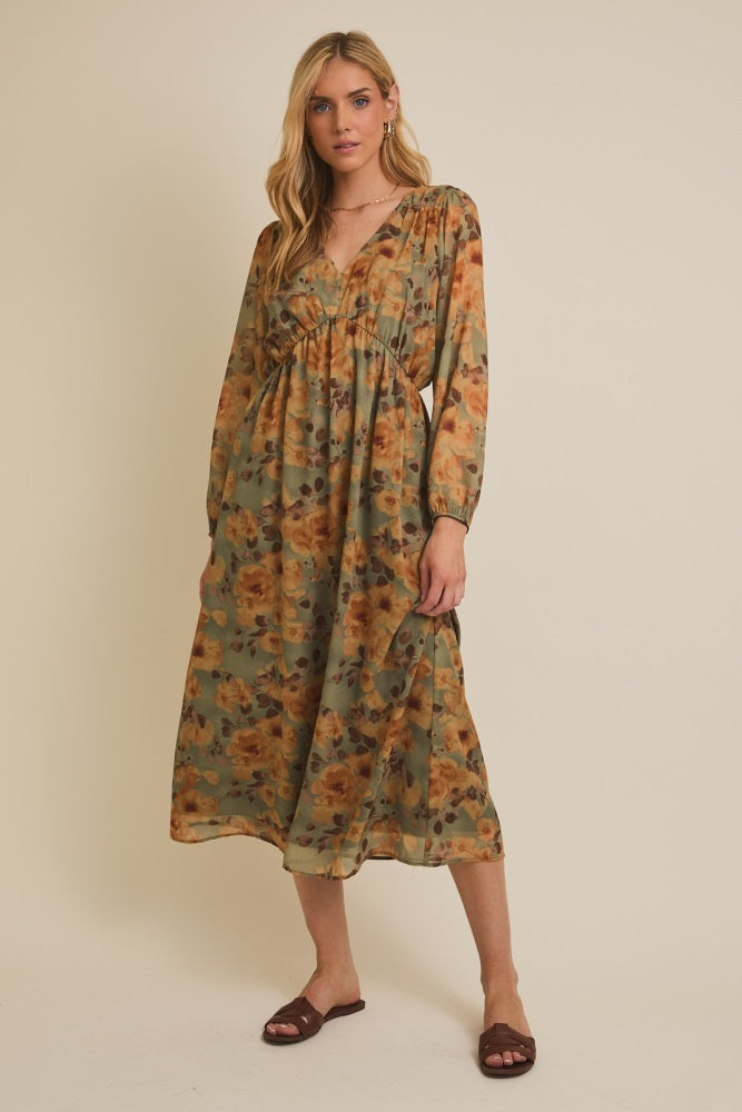 Light Olive Floral V-Neck Long Sleeve Midi Dress