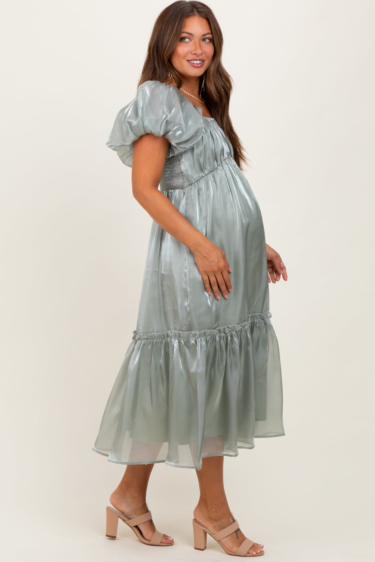 Light Olive Organza Puff Sleeve Maternity Midi Dress