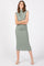 Details A solid fitted midi dress with side ruching and gathered high neckline. Content + Care