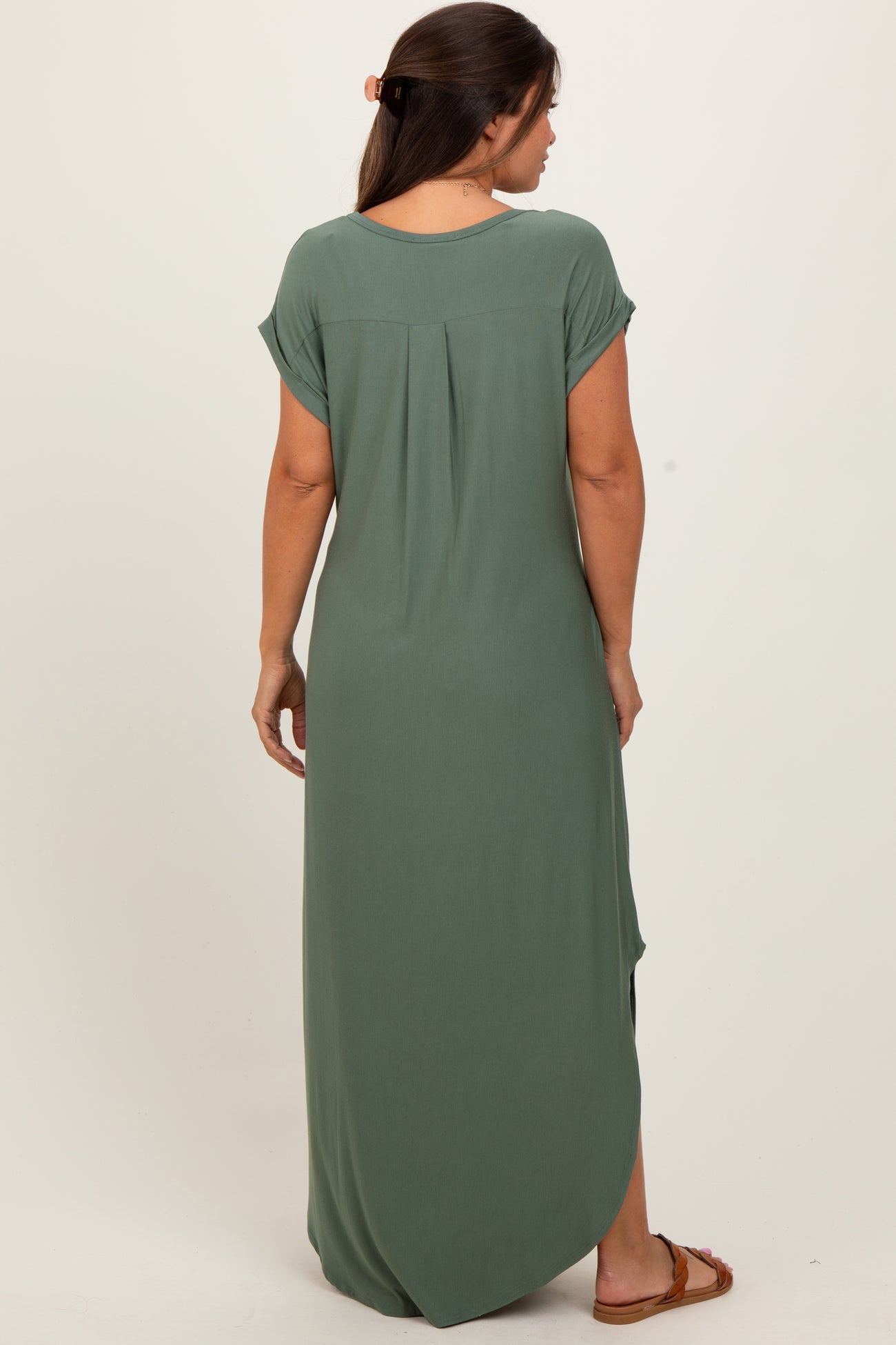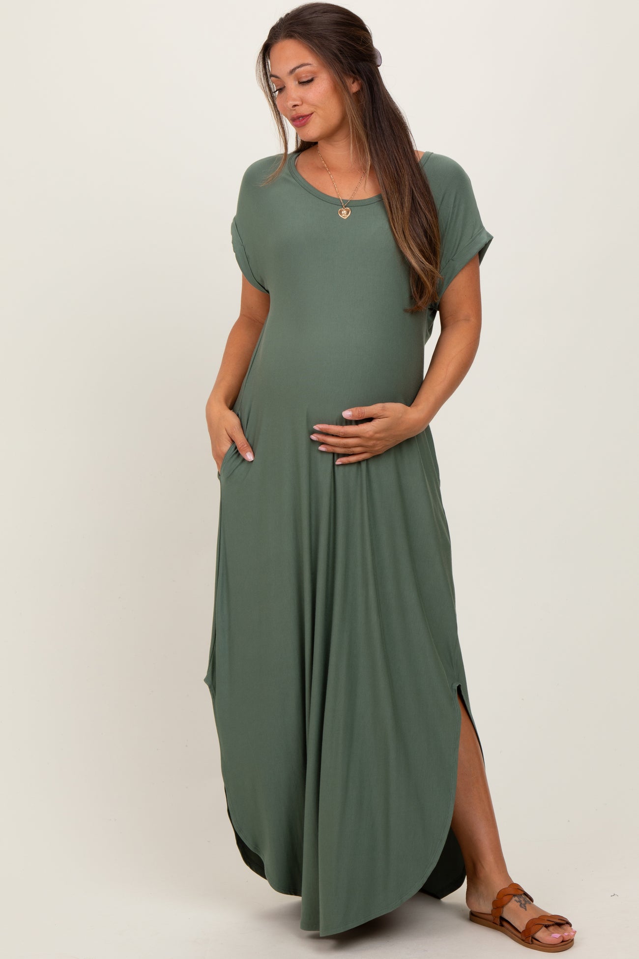 Light Olive Round Hem Side Slit Maternity Maxi Dress