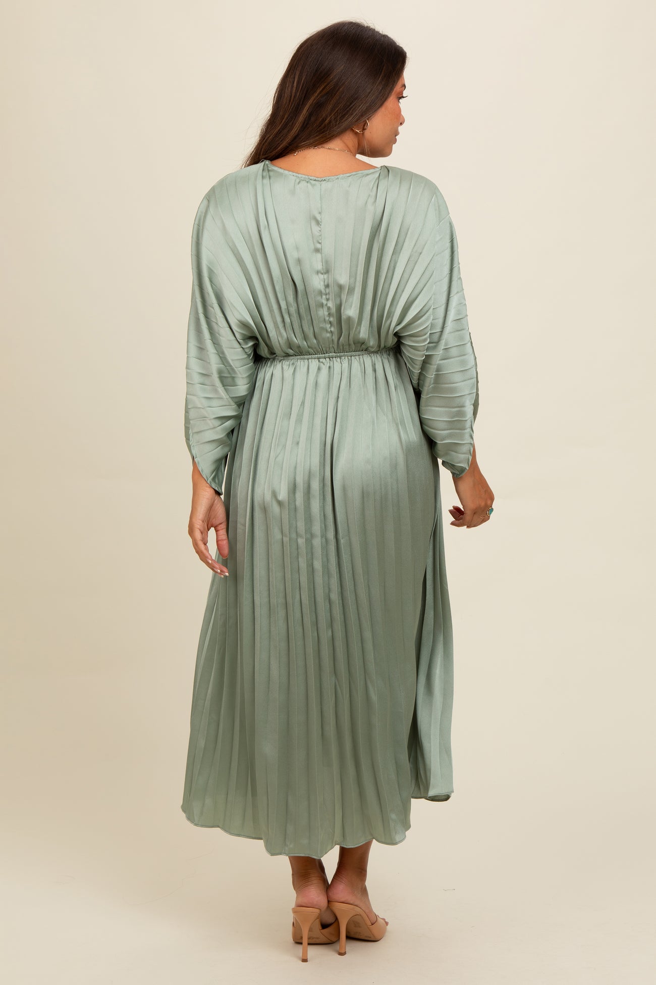 Light Olive Satin Pleated V-Neck Maternity Maxi Dress