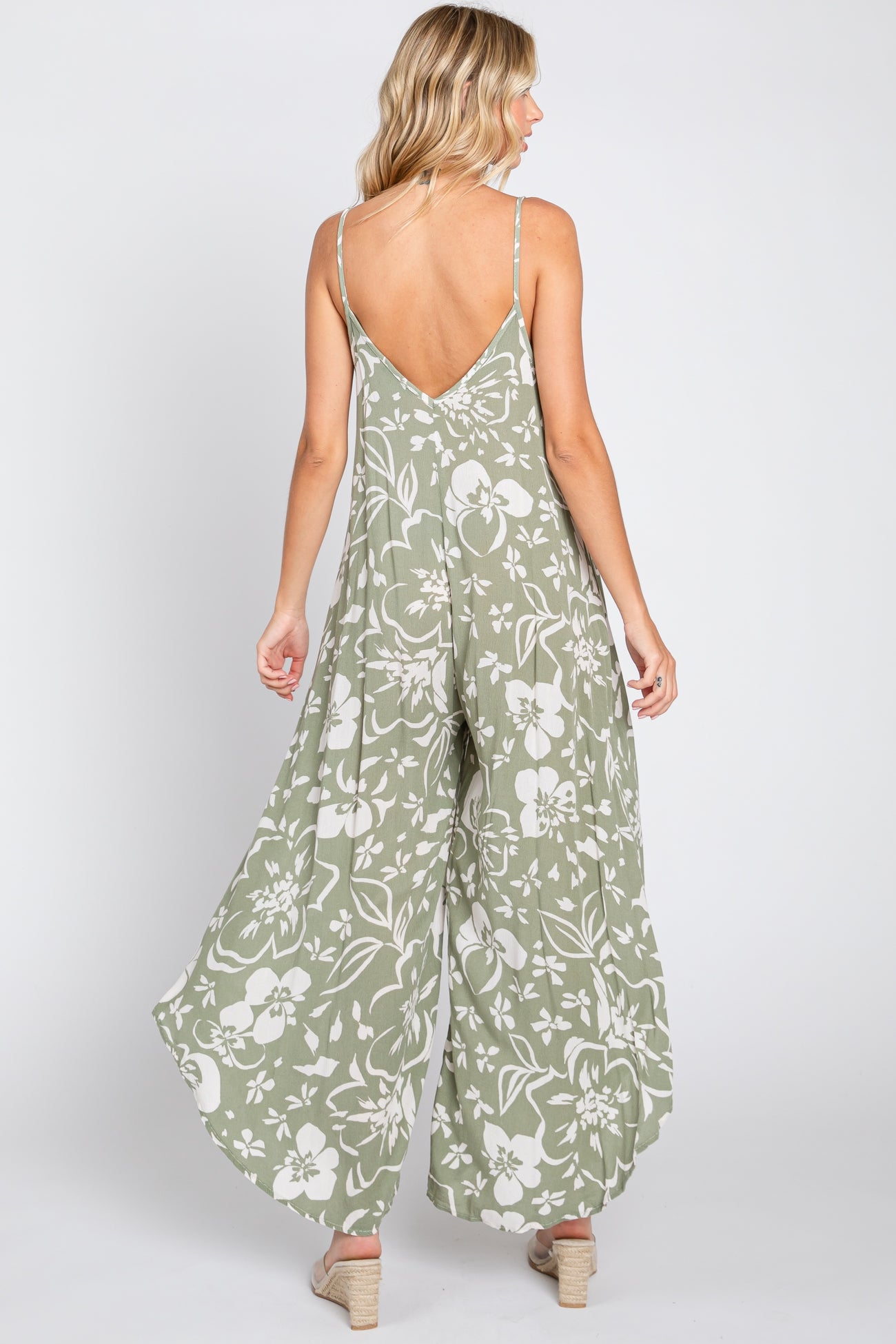 Light Olive Tropical Floral V-Neck Round Hem Midi Dress