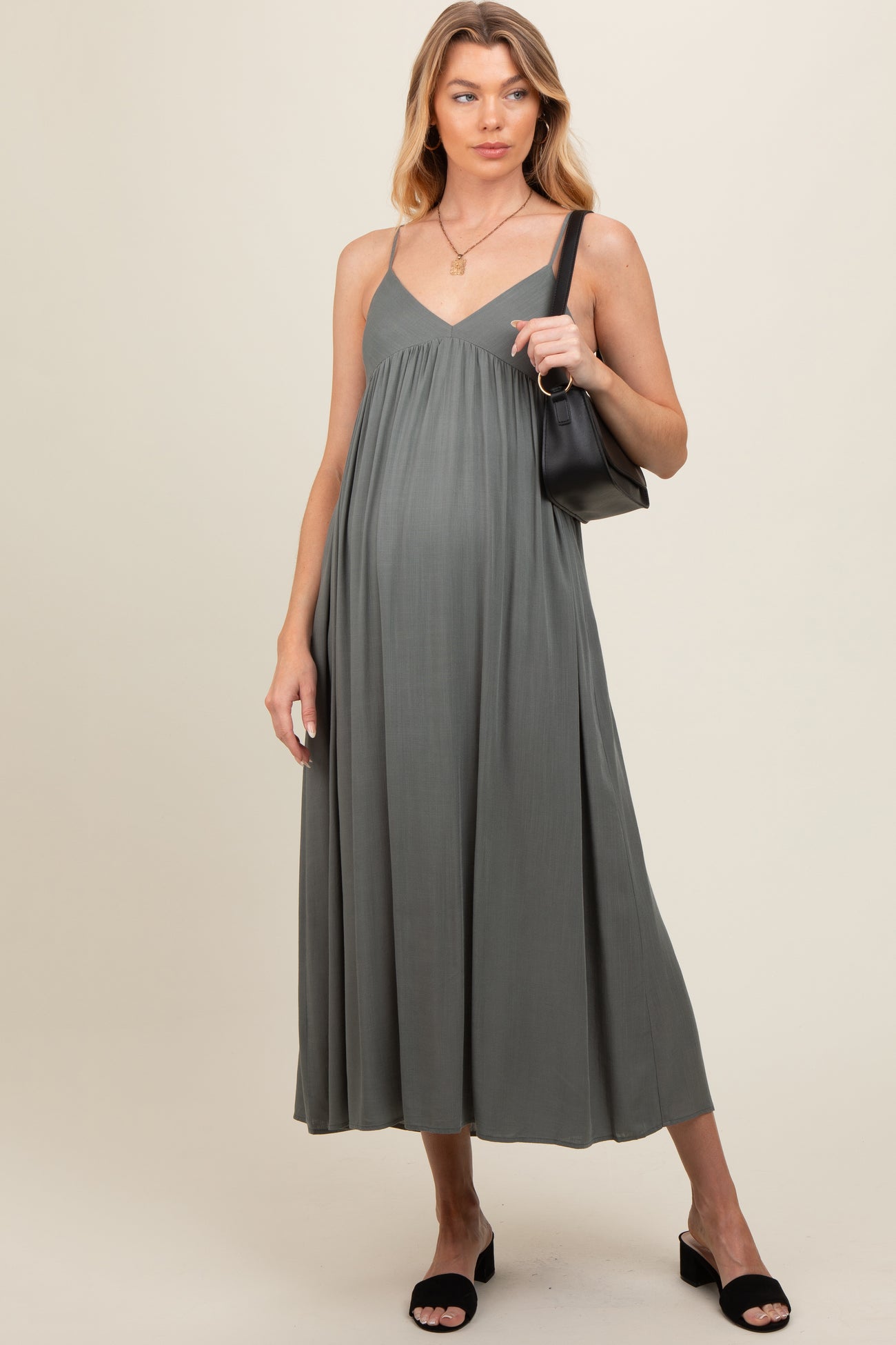 Light Olive V-Neck Sleeveless Maternity Midi Dress