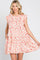 A floral mini dress with a rounded neckline, ruffle accent at the sleeve openings, side pockets, a gathered bottom tier, and a back tie.