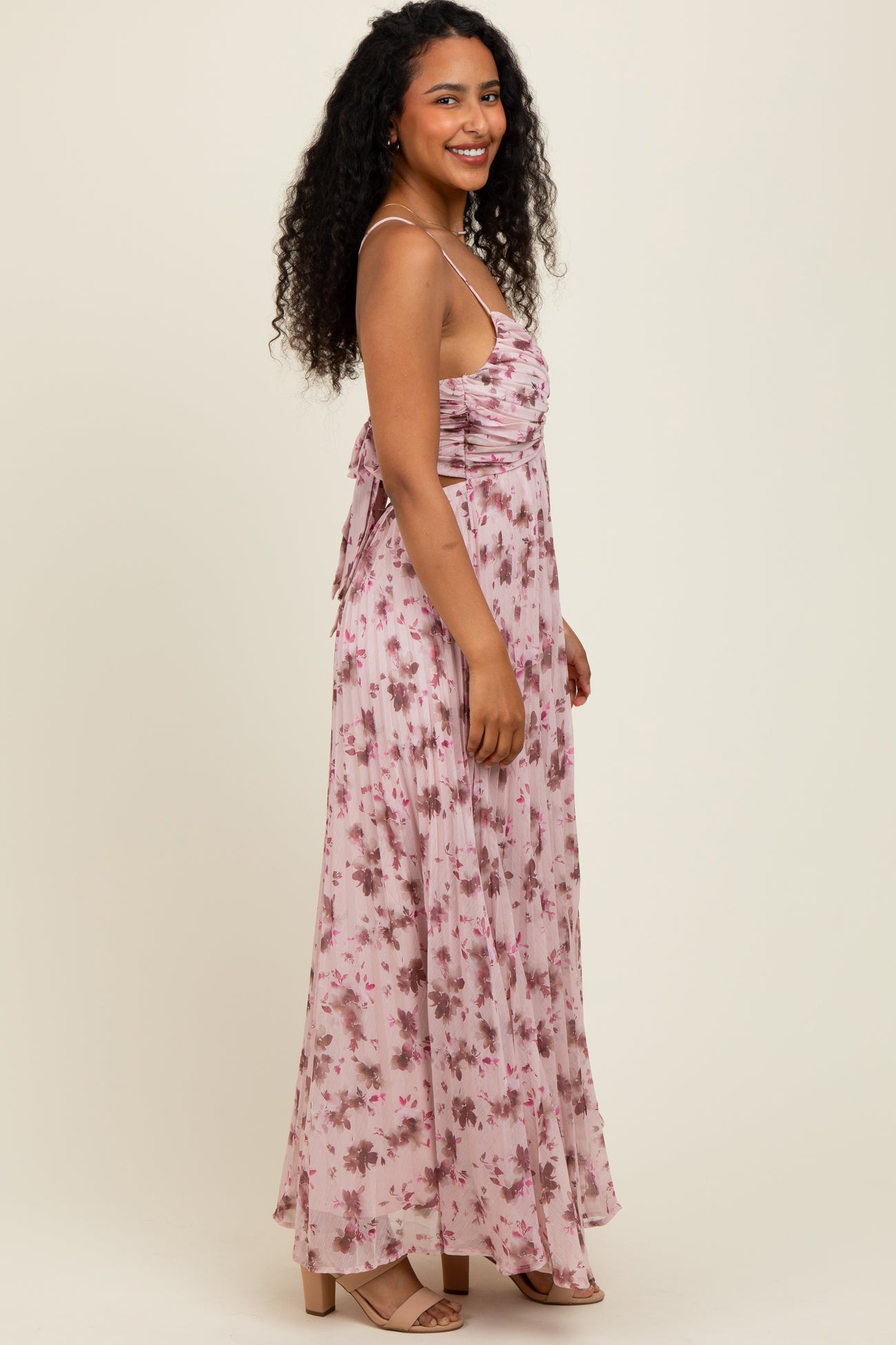 Light Pink Floral Pleated Chiffon Cutout Tie Back Maxi Dress