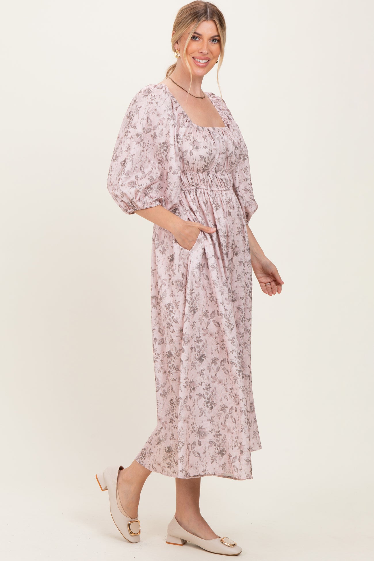Light Pink Floral Puff Sleeve Smocked Waist Midi Dress