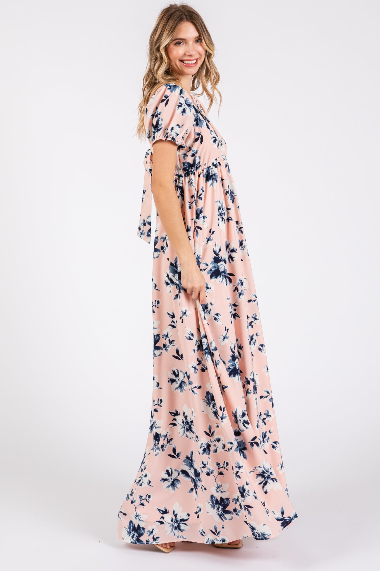 Light Pink Floral V-Neck Puff Sleeve Maxi Dress